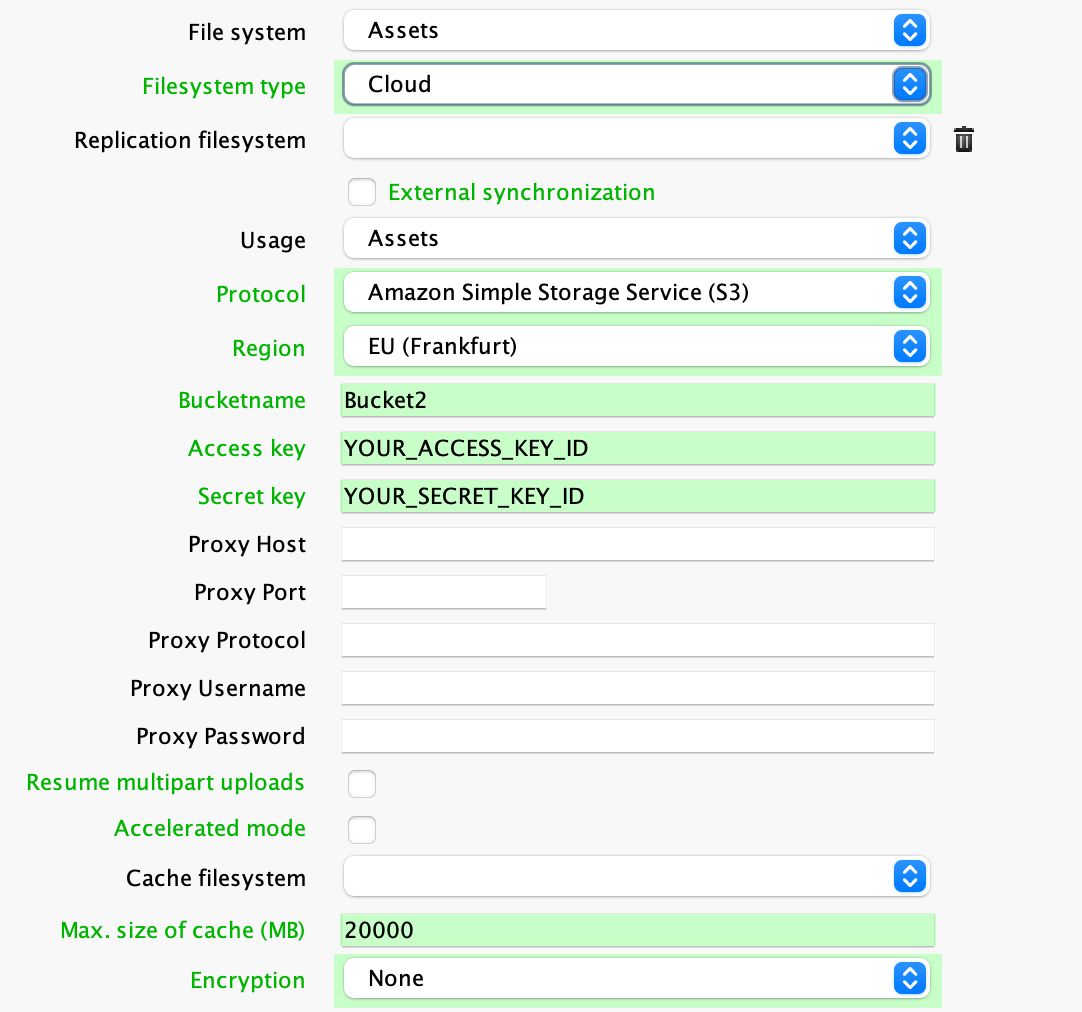 CODE<filesystem external-sync="false" protocol="s3" name="s3-assets" cacheMaxHashTableEntries="200000" usage="assets" url-creator="storage-sequence" type="plain" region="eu-central-1" encryption="NoEncryption" bucketName="bucket2" accessKey="YOUR_ACCESS_KEY_ID" secretKey="YOUR_SECRET_ACCESS_KEY" cacheFileSystem="s3-cache"/>- Click OK to save your changes and close the XML configuration.