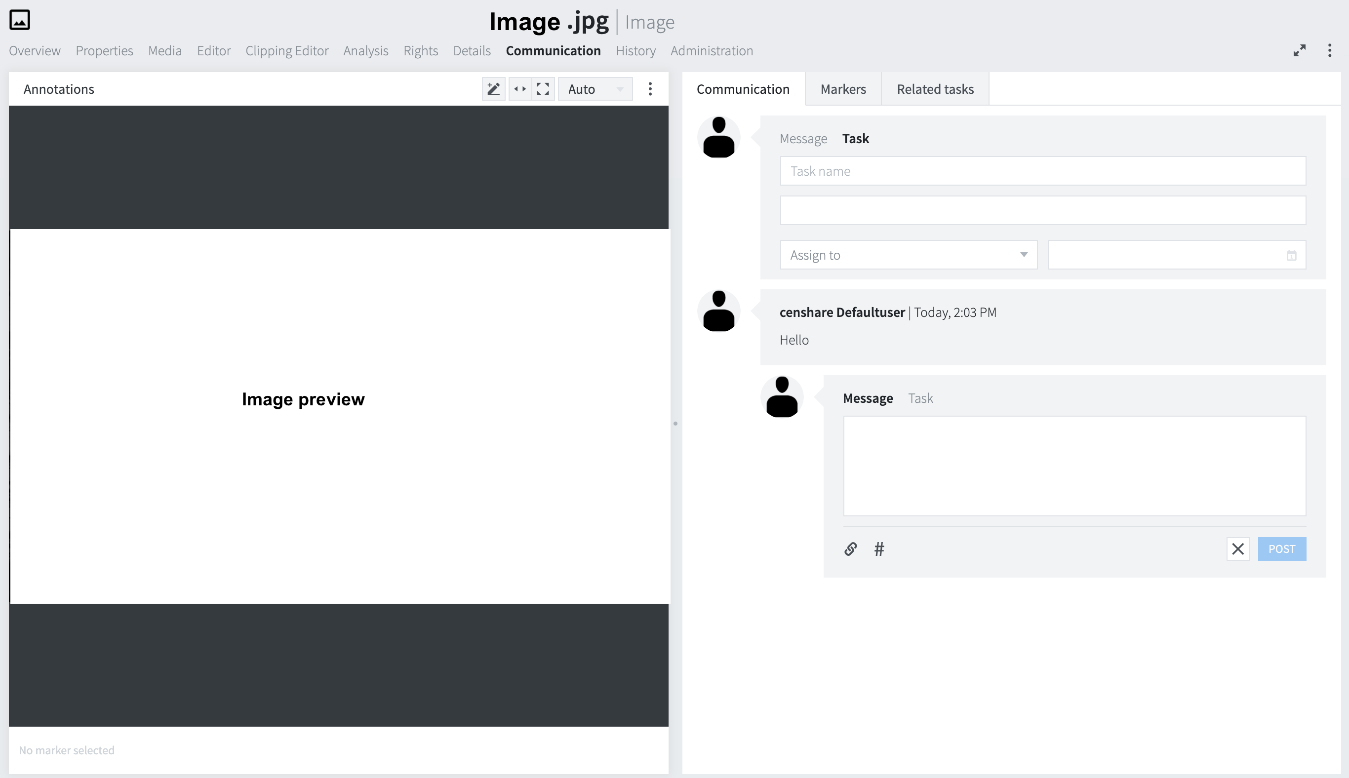 censhare allows you to coordinate with other users regarding all kinds of content and associated information. For every asset, you can create your own threads or reply to existing comments. You can create tasks related to the asset and assign them. For better communication, you can create and refer to markers on previews for certain assets.