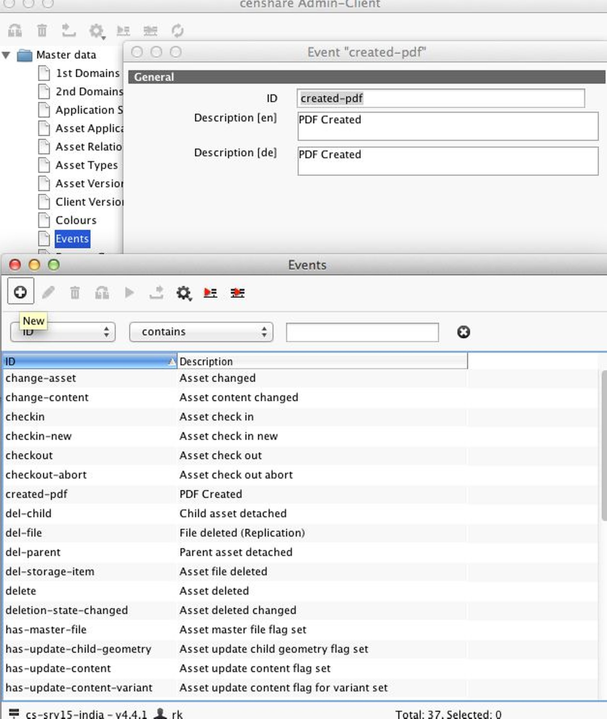 - First, create an event that is executed during the creation of assets from the asset file. Log into the Admin Client and create a new event, e.g. "created-pdf".