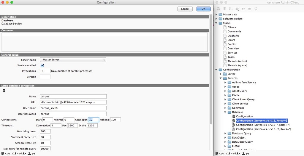 Furthermore, it is to know that the value is only a soft limit. The real limit of database connections is set by the Oracle parameter processes, respectively its RAM (SGA size) allocation. Note that Oracle's default value of 150 processes is sufficient for two censhare servers, but we change it in our DBCA template to 300 processes. We never change the 'sessions' parameter on Oracle, because it's default value is OK = (1.1 * PROCESSES) + 5.