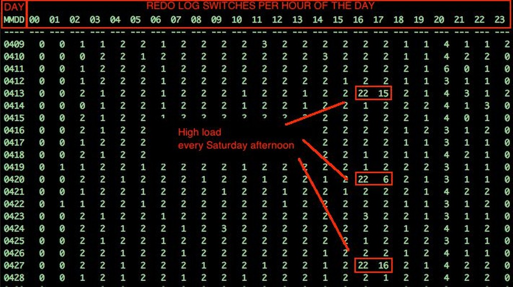 SELECT TO_CHAR(first_time,'MMDD') MMDD, TO_CHAR(SUM(DECODE(TO_CHAR(first_time,'HH24'),'00',1,0)),'99') "00", TO_CHAR(SUM(DECODE(TO_CHAR(first_time,'HH24'),'01',1,0)),'99') "01", TO_CHAR(SUM(DECODE(TO_CHAR(first_time,'HH24'),'02',1,0)),'99') "02", TO_CHAR(SUM(DECODE(TO_CHAR(first_time,'HH24'),'03',1,0)),'99') "03", TO_CHAR(SUM(DECODE(TO_CHAR(first_time,'HH24'),'04',1,0)),'99') "04", TO_CHAR(SUM(DECODE(TO_CHAR(first_time,'HH24'),'05',1,0)),'99') "05", TO_CHAR(SUM(DECODE(TO_CHAR(first_time,'HH24'),'06',1,0)),'99') "06", TO_CHAR(SUM(DECODE(TO_CHAR(first_time,'HH24'),'07',1,0)),'99') "07", TO_CHAR(SUM(DECODE(TO_CHAR(first_time,'HH24'),'08',1,0)),'99') "08", TO_CHAR(SUM(DECODE(TO_CHAR(first_time,'HH24'),'09',1,0)),'99') "09", TO_CHAR(SUM(DECODE(TO_CHAR(first_time,'HH24'),'10',1,0)),'99') "10", TO_CHAR(SUM(DECODE(TO_CHAR(first_time,'HH24'),'11',1,0)),'99') "11", TO_CHAR(SUM(DECODE(TO_CHAR(first_time,'HH24'),'12',1,0)),'99') "12", TO_CHAR(SUM(DECODE(TO_CHAR(first_time,'HH24'),'13',1,0)),'99') "13", TO_CHAR(SUM(DECODE(TO_CHAR(first_time,'HH24'),'14',1,0)),'99') "14", TO_CHAR(SUM(DECODE(TO_CHAR(first_time,'HH24'),'15',1,0)),'99') "15", TO_CHAR(SUM(DECODE(TO_CHAR(first_time,'HH24'),'16',1,0)),'99') "16", TO_CHAR(SUM(DECODE(TO_CHAR(first_time,'HH24'),'17',1,0)),'99') "17", TO_CHAR(SUM(DECODE(TO_CHAR(first_time,'HH24'),'18',1,0)),'99') "18", TO_CHAR(SUM(DECODE(TO_CHAR(first_time,'HH24'),'19',1,0)),'99') "19", TO_CHAR(SUM(DECODE(TO_CHAR(first_time,'HH24'),'20',1,0)),'99') "20", TO_CHAR(SUM(DECODE(TO_CHAR(first_time,'HH24'),'21',1,0)),'99') "21", TO_CHAR(SUM(DECODE(TO_CHAR(first_time,'HH24'),'22',1,0)),'99') "22", TO_CHAR(SUM(DECODE(TO_CHAR(first_time,'HH24'),'23',1,0)),'99') "23"