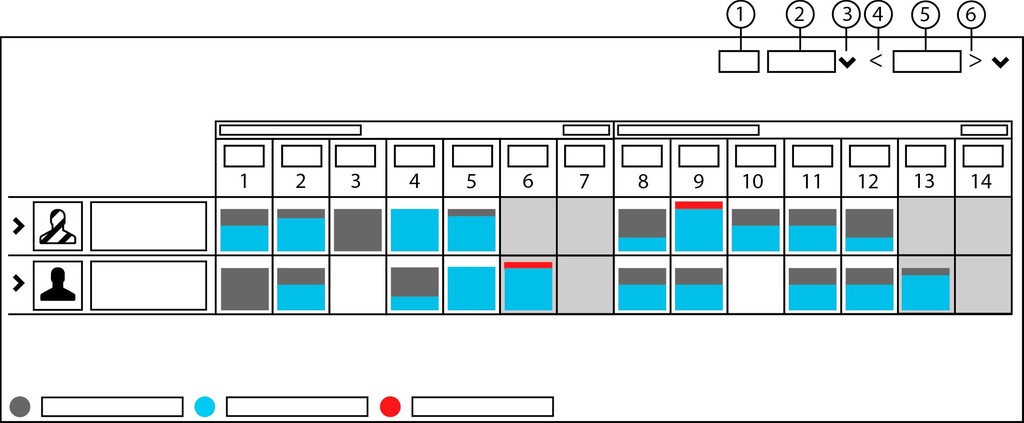 5 | Box, completely blue with red bar | The calculated working time for all tasks on this day exceeds the available working time of the member. The working day is overbooked. |