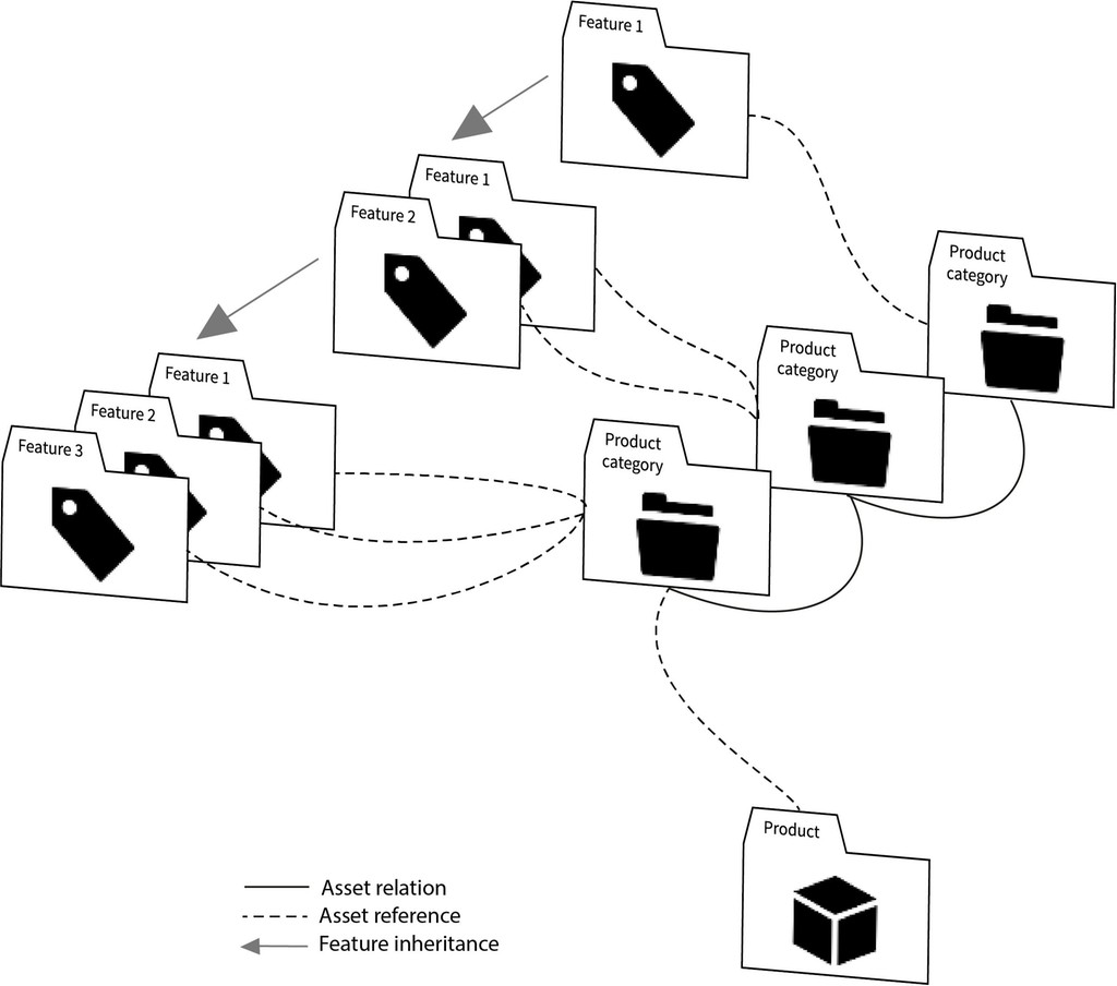 Product categories form a hierarchical classification. The Product category hierarchy relation controls the inheritance of Features. Inherited Features are referenced in child Product categories and added to Products.