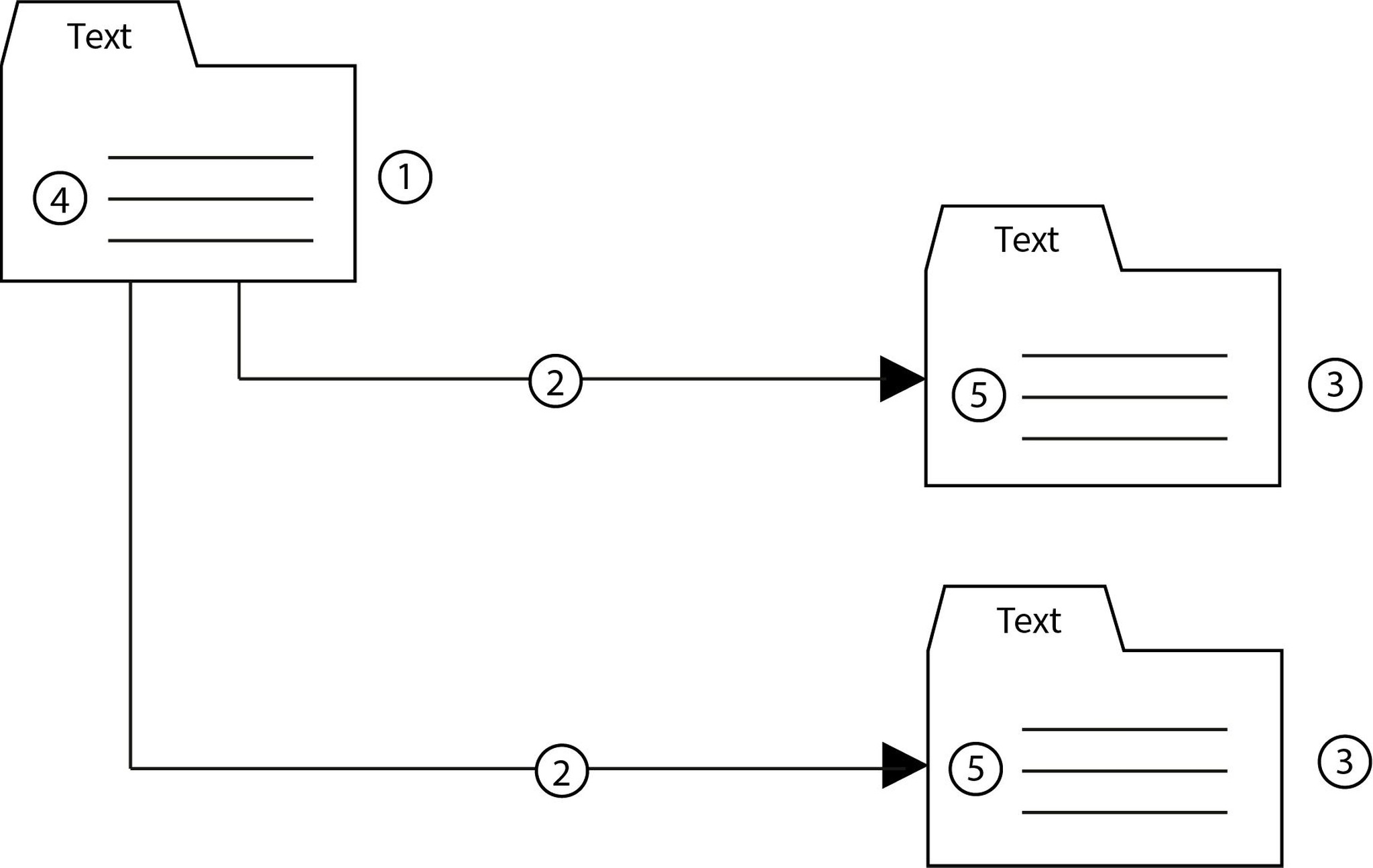 The translation memory works with text that is saved in XML format in assets. Text assets can be part of an asset structure. For example, an article or a website. Every language is created in its own text asset. The source language functions as the master for other languages. You can link multiple languages to the source language. One language can be set up as both the source and target language.