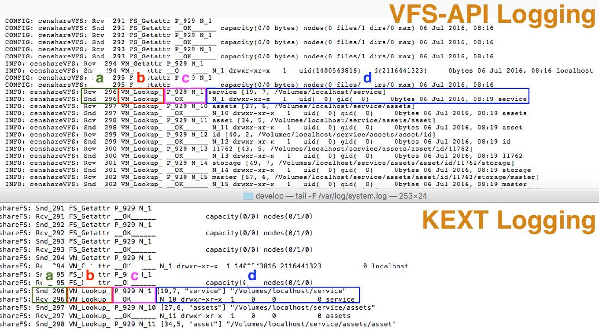 The structure of the log messages, coming from the KEXT compared to the messages coming from the VFS-API logging, are nearly the same. The content of those messages depends on the kind of request.