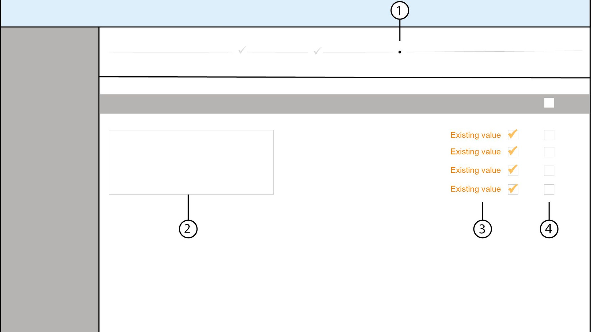 In step 3 of the wizard, on the "Select properties" (1) page, the source property values (2) are displayed. (3) indicates, if these properties are already set for the target asset. To copy any values or properties, check the boxes (4) to the right.