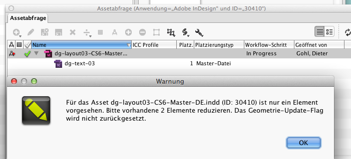 In order to prevent unintended loss of information, this flag can only be resolved after a manual removal of pages in the asset planning in the censhare Client. When you use the geometry update action from the InDesign palette, the following warning will be displayed: Please reduce available elements .