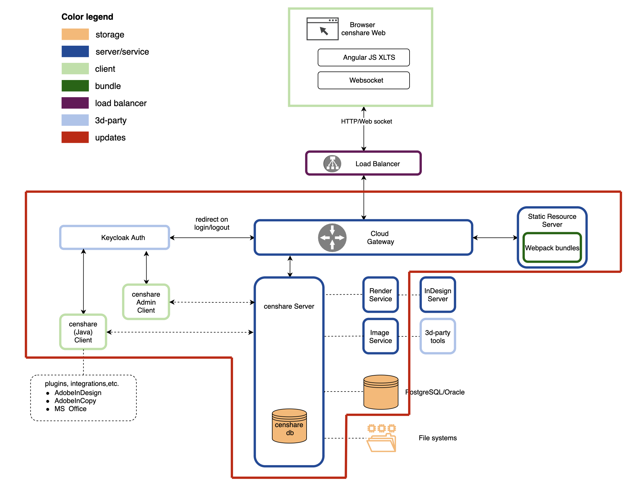 The adapted censhare WP architecture diagram shows which components are being updated. (Find the full diagram from here).