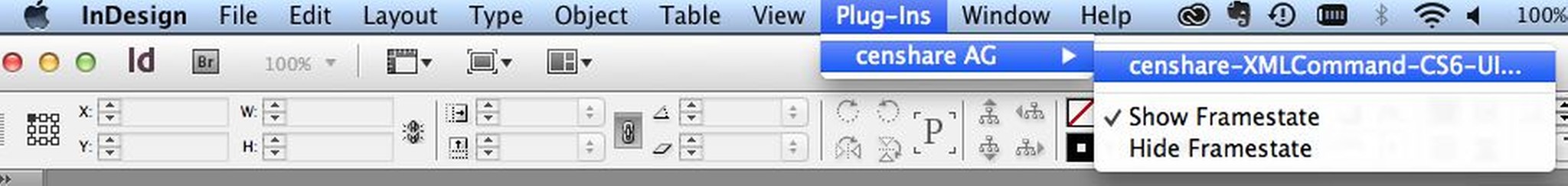 Go to menu options "Plug-Ins → Censhare AG → censhare-XMLCommand-CS6-UI.." as per the below screenshot. Click on censhare-XMLCommand-.....