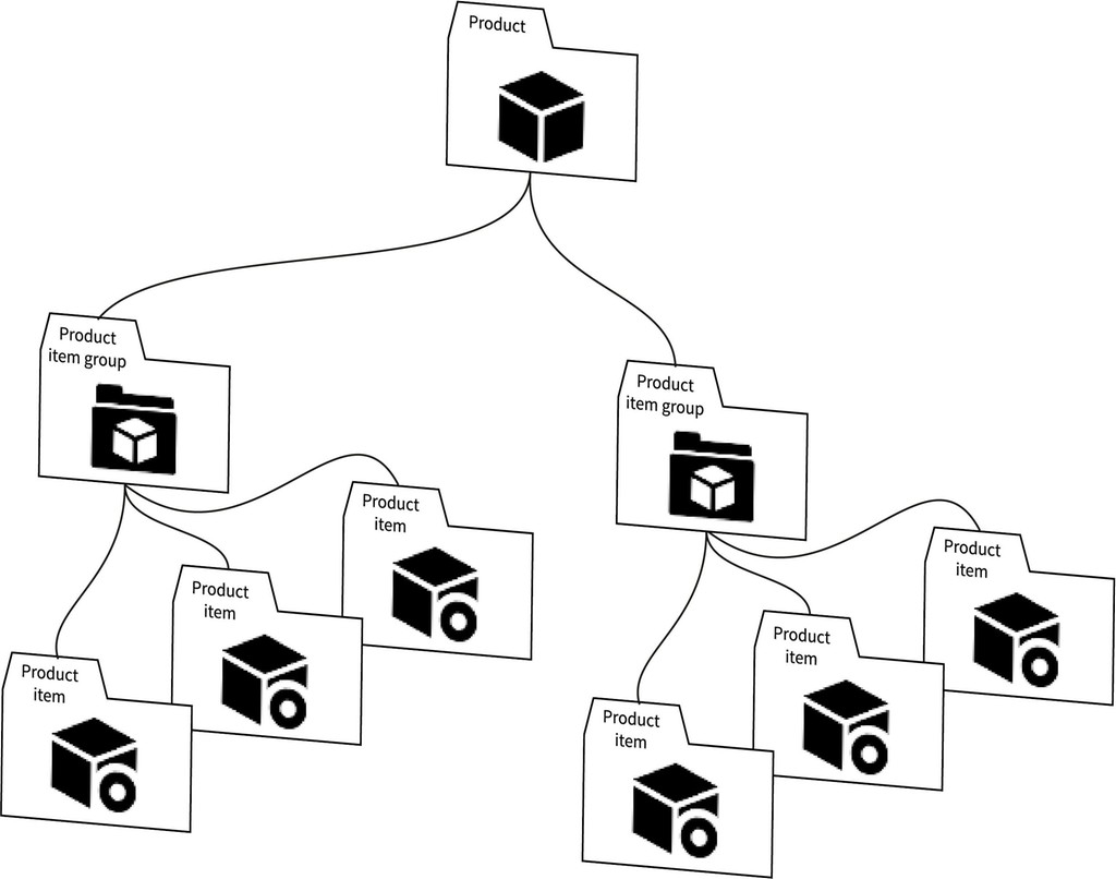 Product item groups are structural assets that can be used to group product items. If a Product item group is assigned to a Product, the respective Product items are automatically assigned to the Product.
