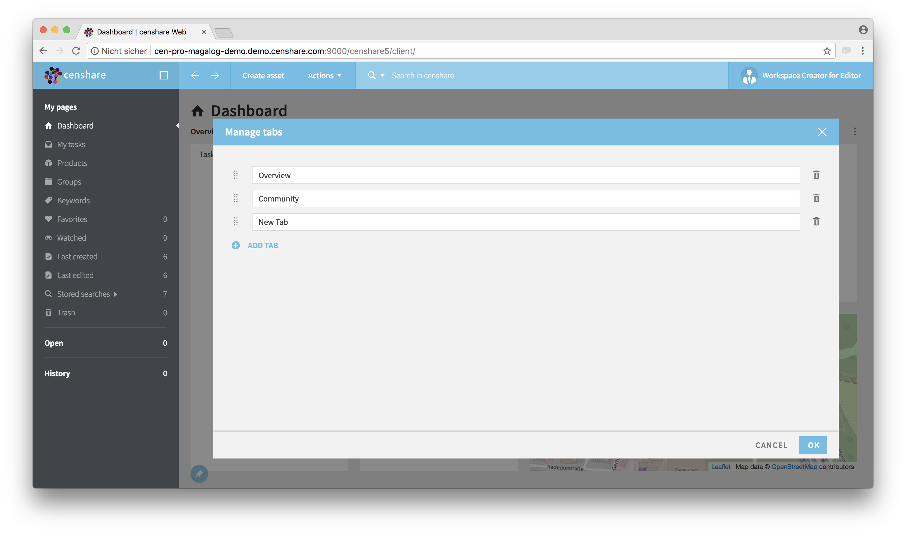 Resume: You have now created a customized dashboard for the user "Workspace creator for editor".