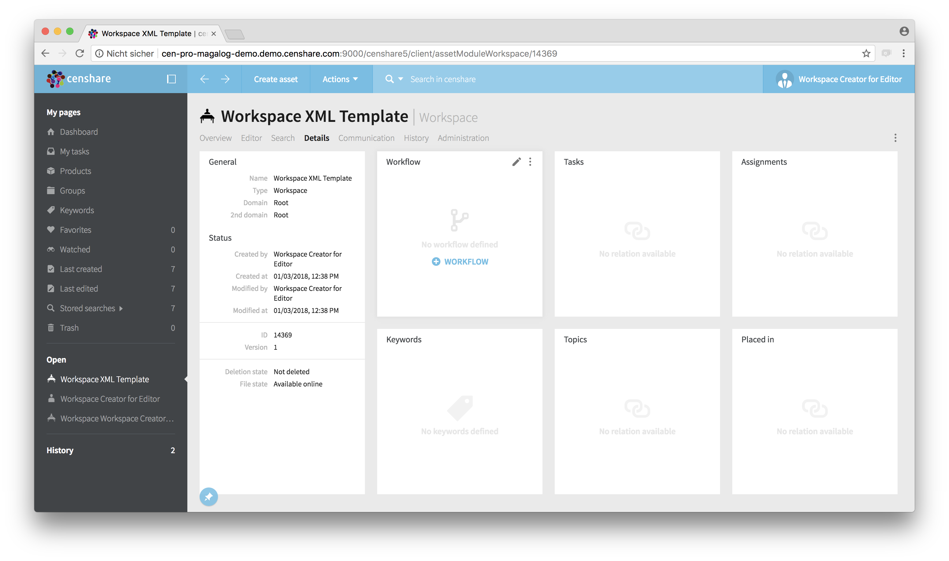 XML workspace templates store a complete workspace in a single XML file. For administrators of censhare instances, this is a convenient way to create workspace templates based on the default workspace structure of censhare Web.