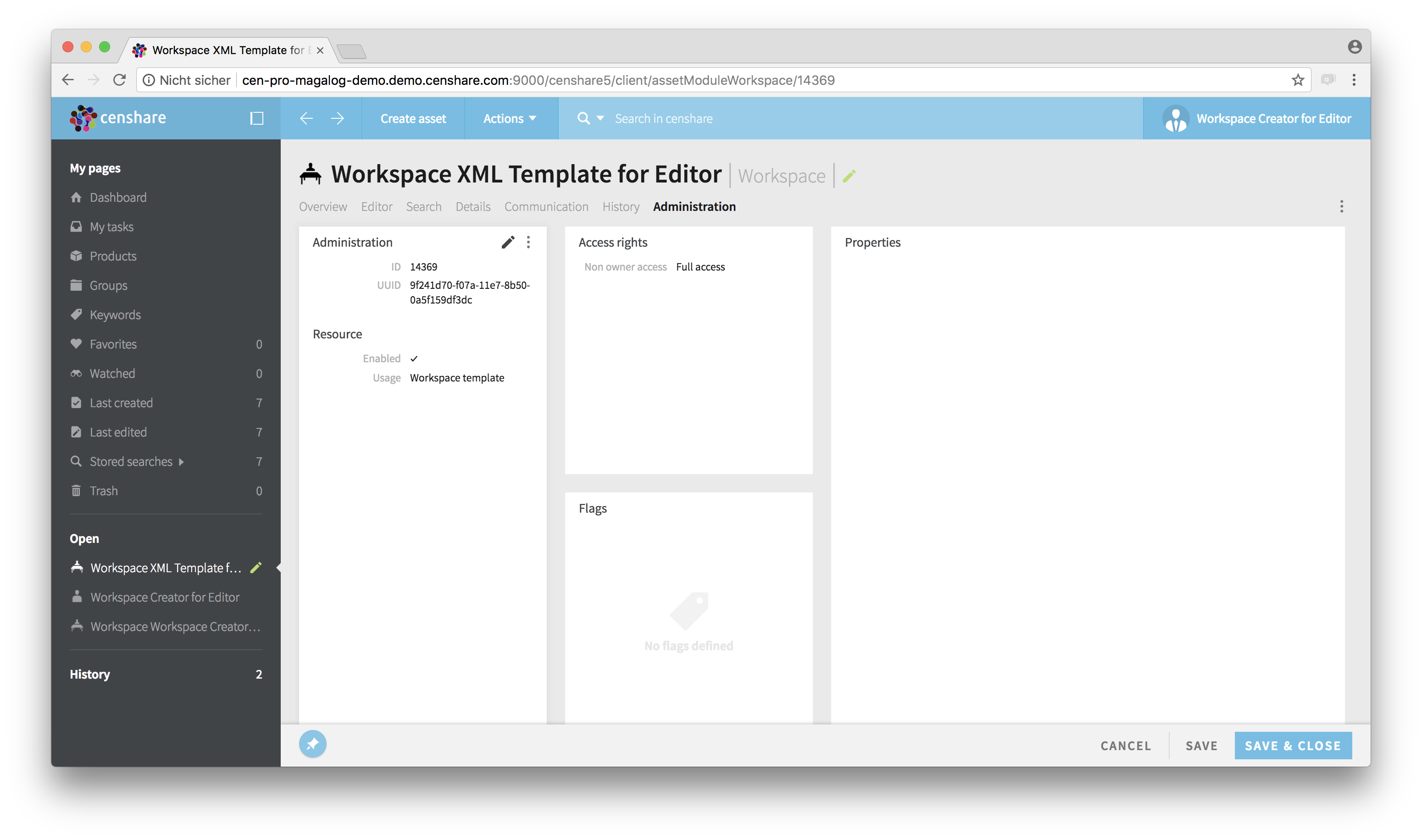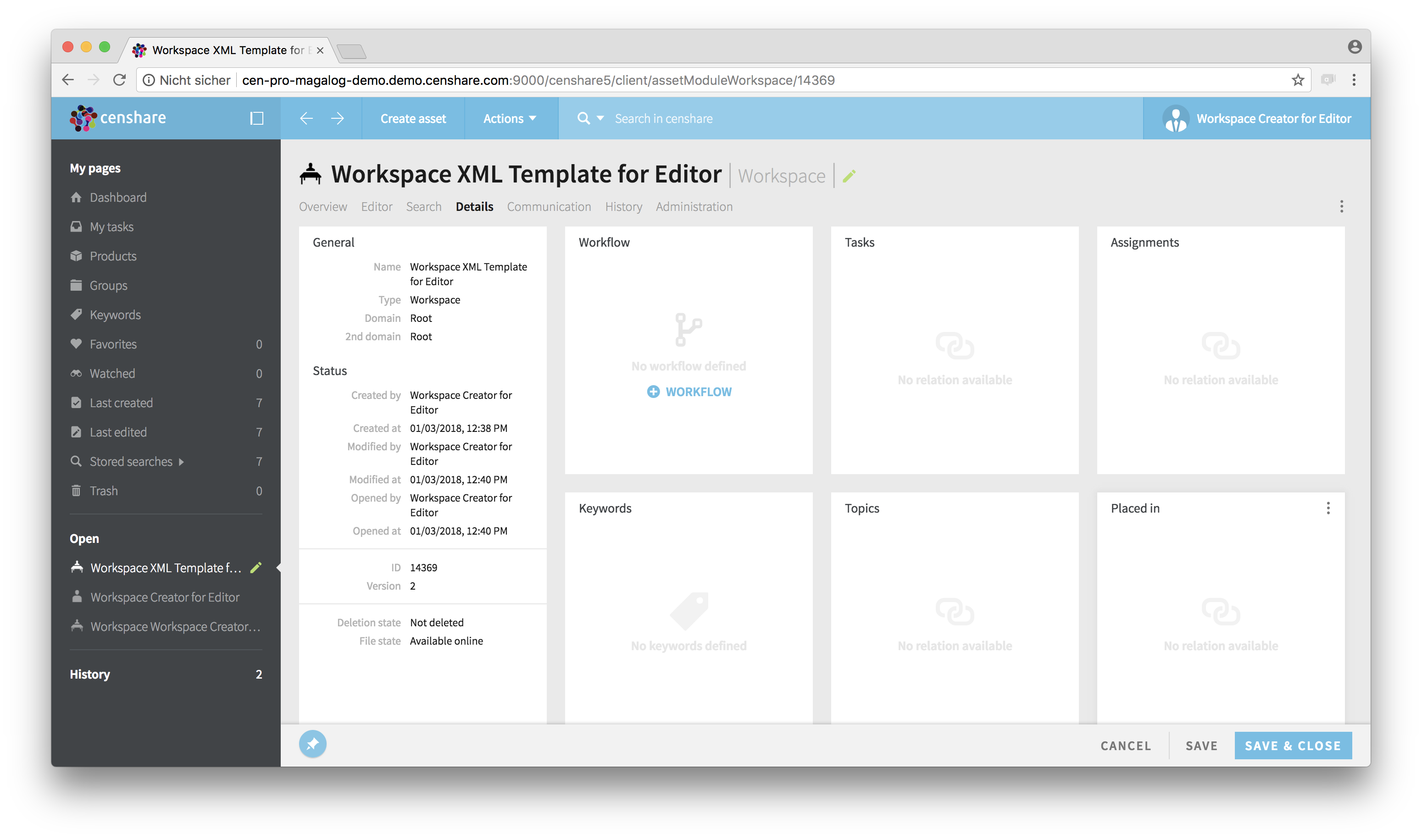 Resume: You have opened the customized workspace asset of the user "Workspace creator for editor" in order to create the XML template from this workspace.