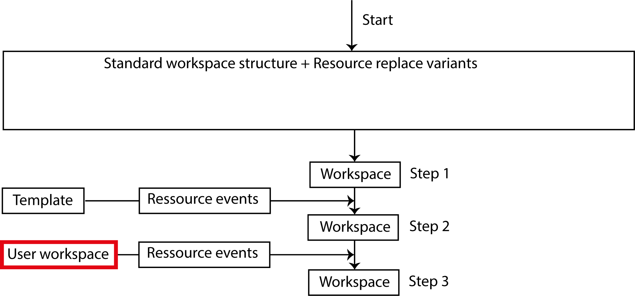 When a user logs in, censhare reads the resource events in her user workspace and applies them. This happens after censhare has read the standard workspace structure, the configured resource replace variants and the resource events in the workspace templates.