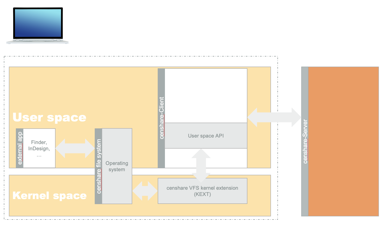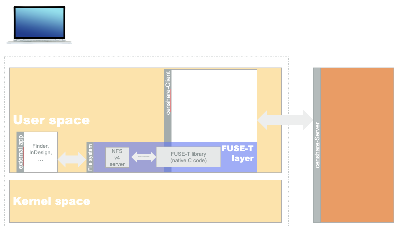 The kernel space provides access to mass storage devices, the network, etc. by providing an abstract interface for accessing data, wherever it is stored. Mounted volumes on your computer use exactly this abstract interface to display your files and folders within e.g. the Finder. The censhare VFS 2.0 uses this technology, too. It is divided into a kernel extension (KEXT) and a user space API. The KEXT is loaded into the kernel and is available when your computer is running. It is the heart of the virtual filesystem and implements several functions that are triggered by the kernel and/or applications from the user space. These are functions such as "mount", "unmount", "give me the content of directory w", "does file x exist", "open file y", "read n bytes of file z starting at position m", and so on. The user space API provides several methods to control the virtual filesystem and to check its health (mount & unmount it, configure it, is it mounted, ...). It also mirrors the most significant requests to the KEXT into the censhare Client, which uses the API.