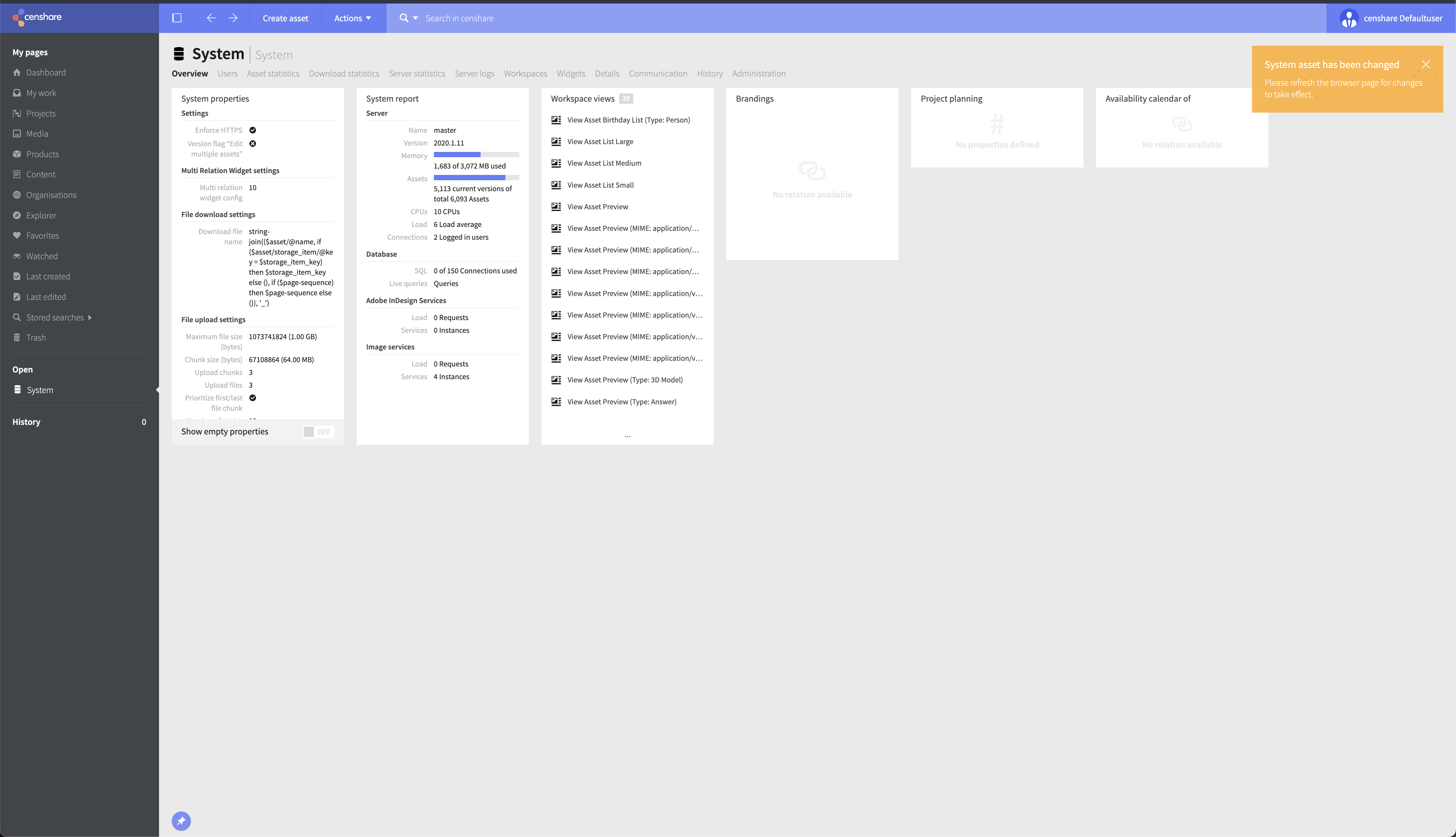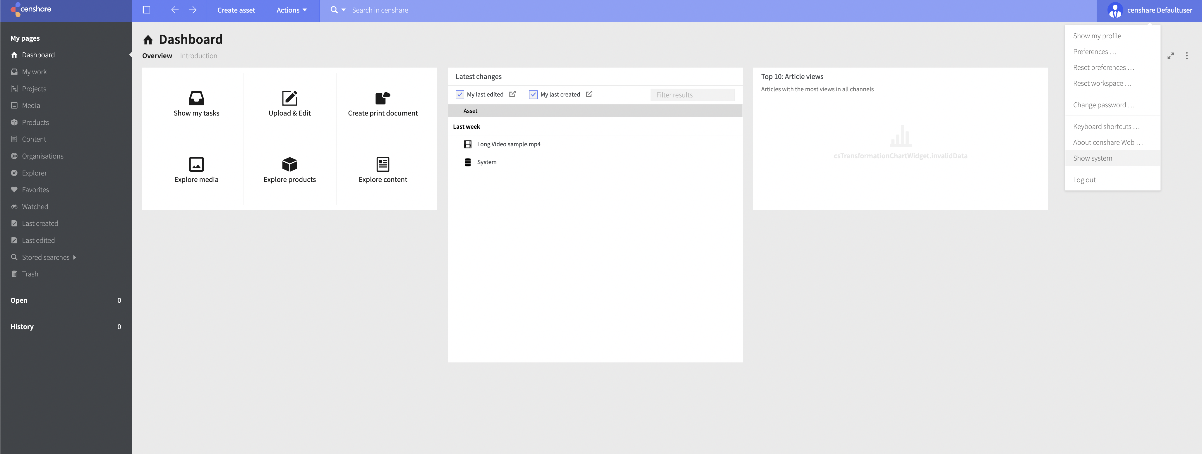 - Log in to censhare Web via user who has system user / system administration permission. This is necessary to see System menu on censhare Web.
