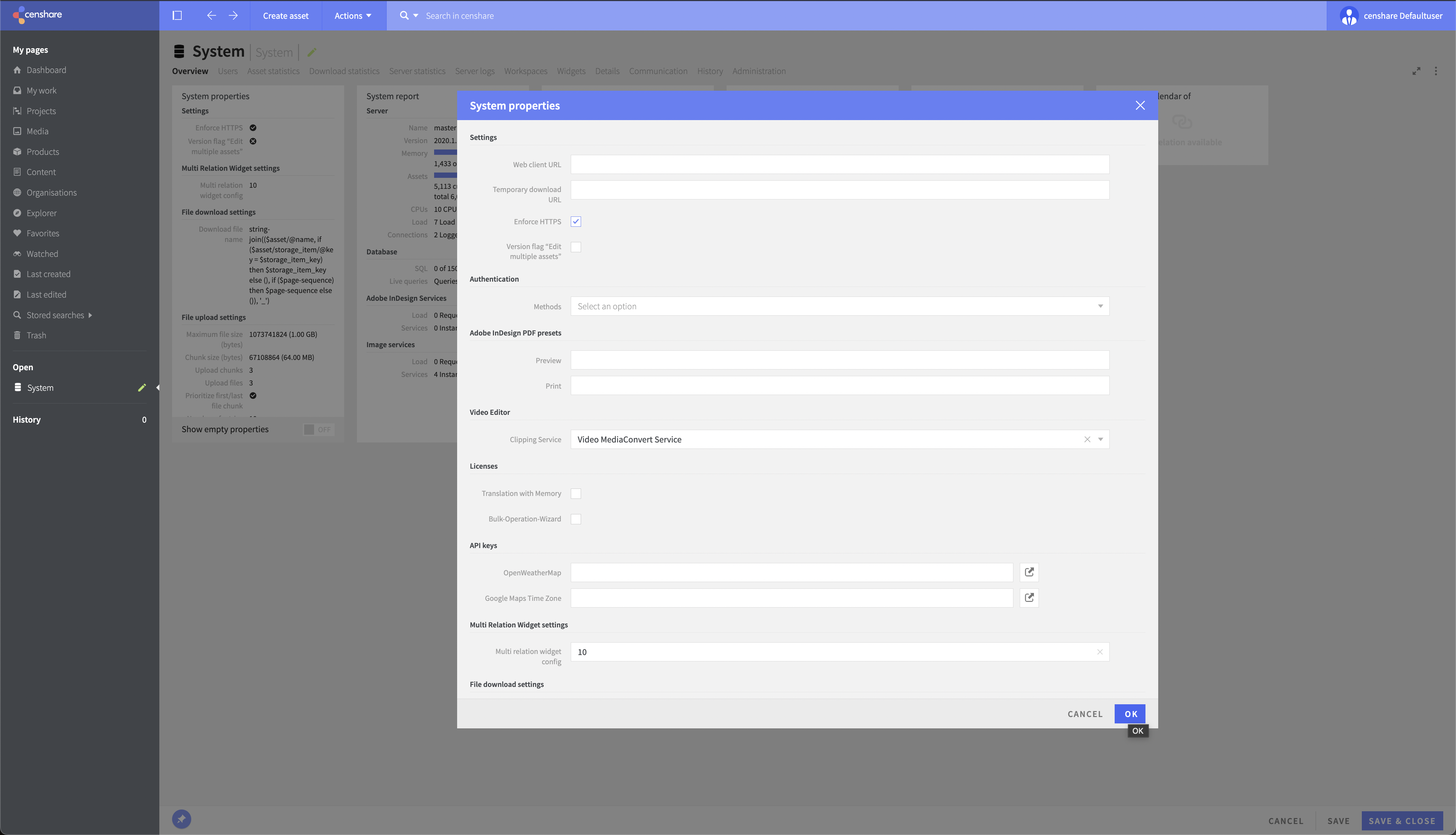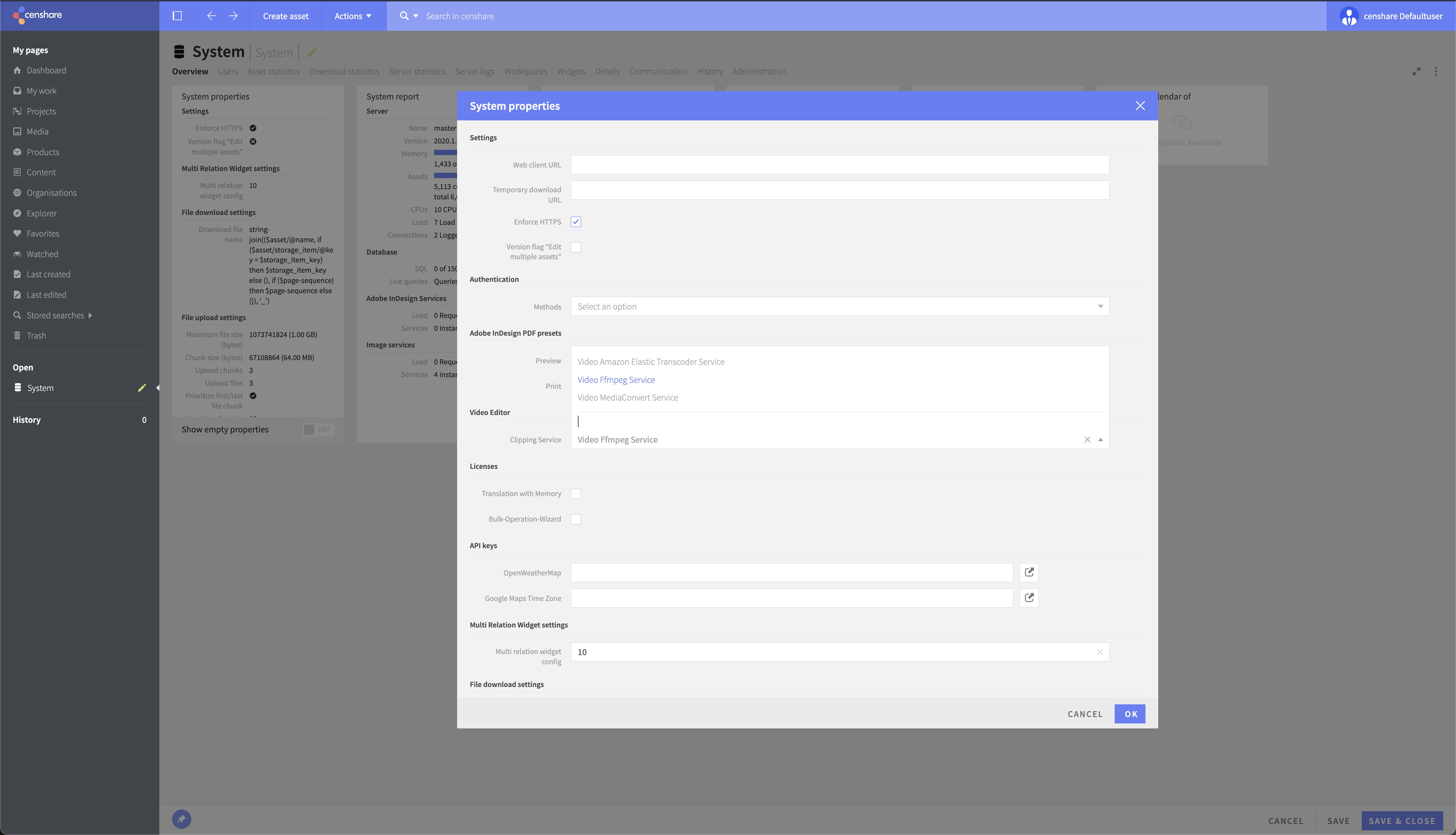 - On the System properties, go to Video Editor and select the media service that you want to use for video transcoding: