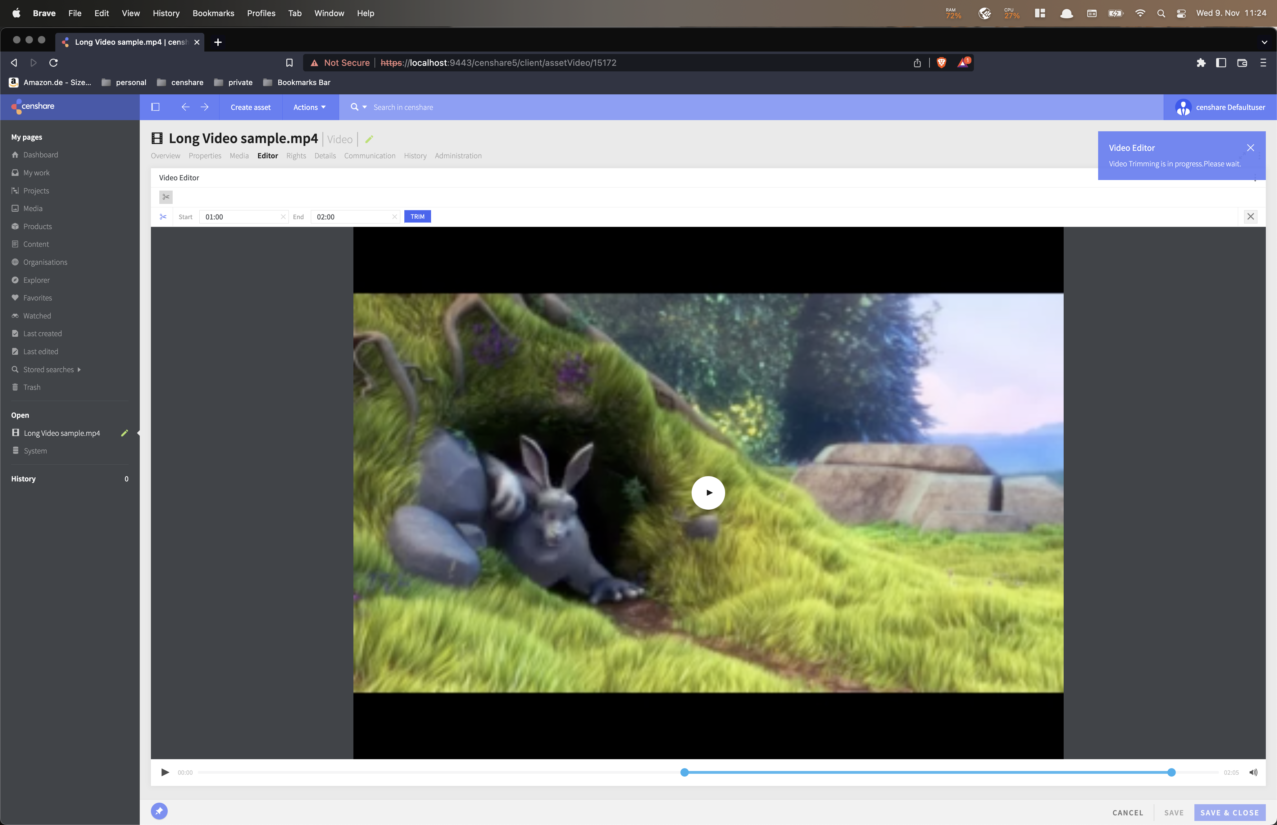 - Go to the Editor tab of an video asset: Add the start and end time for transcoding.