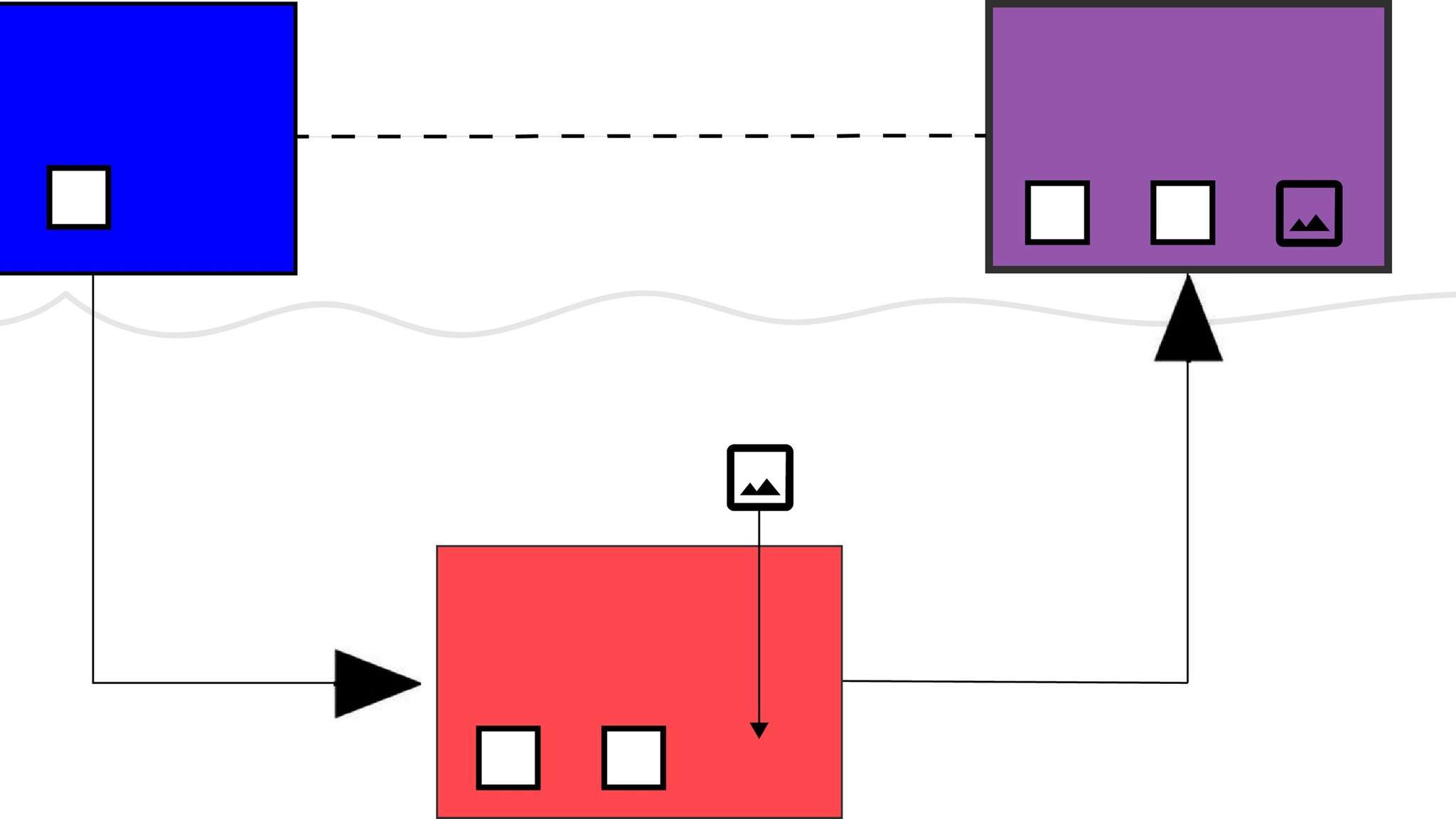 Release process: Published parent asset (blue) and working copy with updated content (red) are merged to a new version of the published asset (purple).