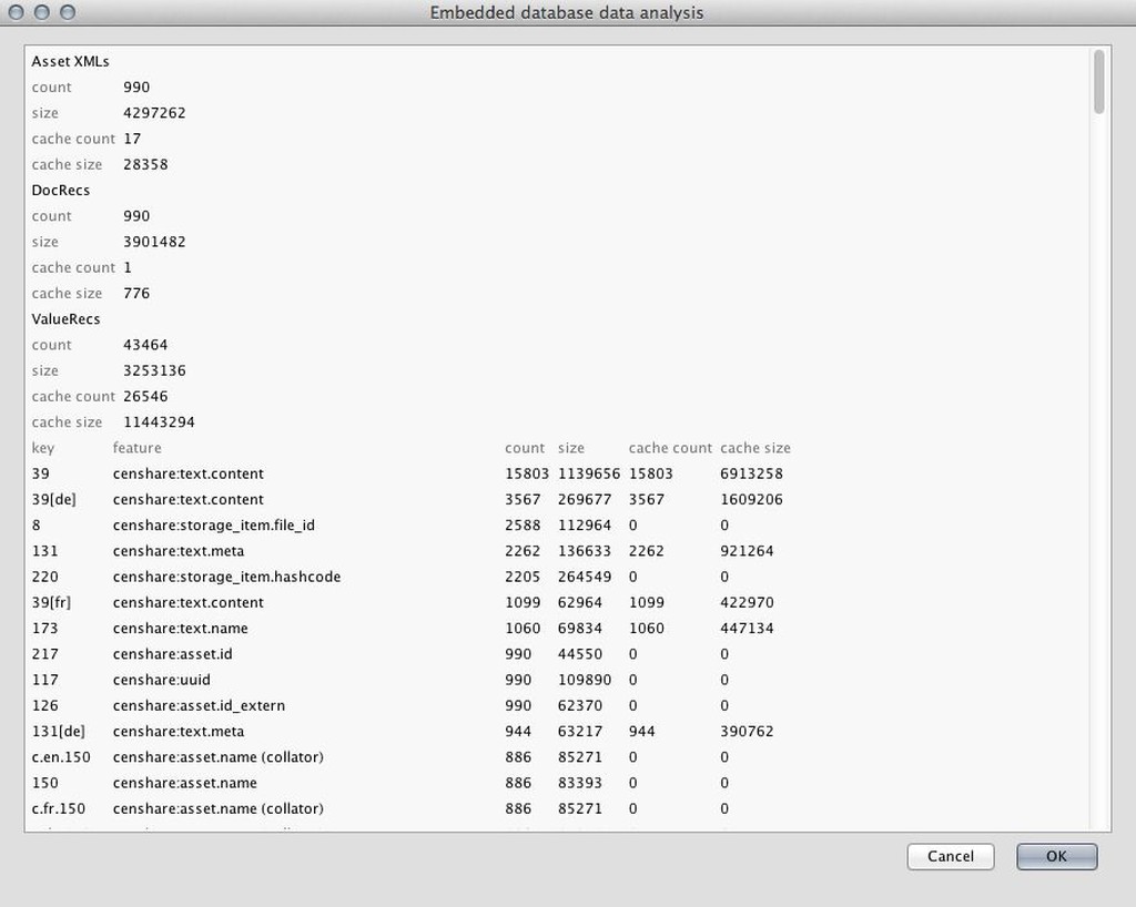 The admin module "Embedded database statistics" has been designed more clearly and provides further information by formatting the output via XML/XSLT. You can still find it in the Tools menu (Gear) in the Admin-Client. In addition, there is now a separate module for precise analysis of resource requirements of the data called "Embedded database data analysis." By the downward sorting order, you can easily isolate the heavyweights in the CDB. From left to right the column headings refer to Key, the name of the feature, the total number, the total size, the number of entries in the cache and the amount of memory it occupies (cache size).