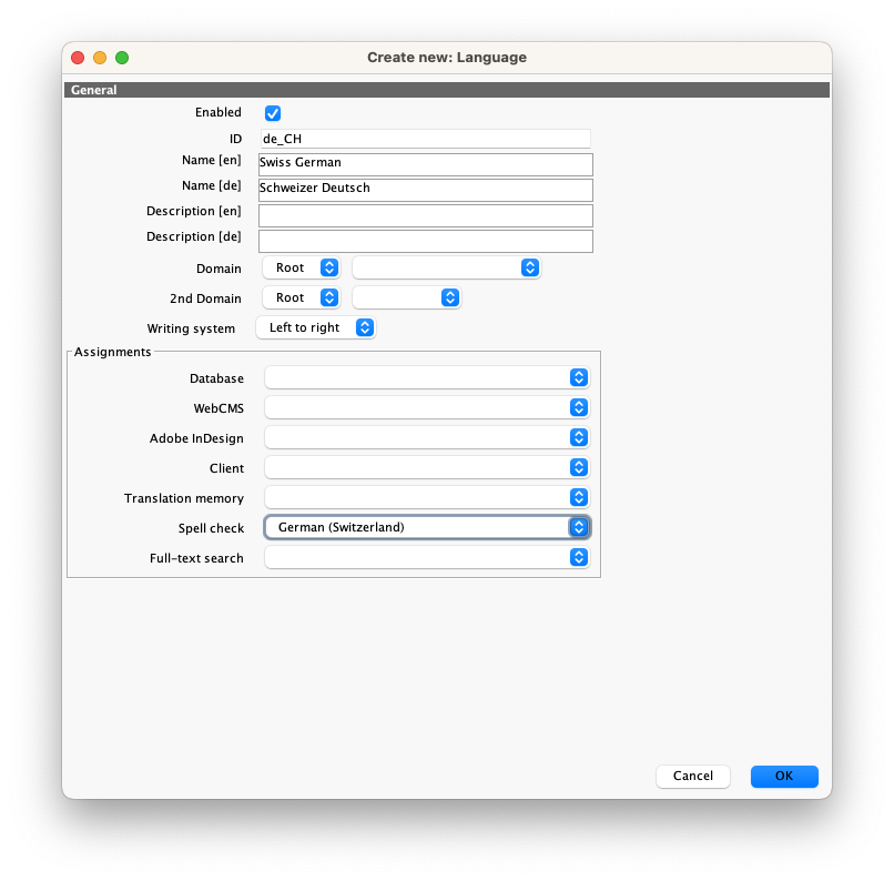 You do not have to fill out all Assignments. For the purpose of spellchecking, you only need to select a language from the Spell check dropdown. Those are existing ISO languages.