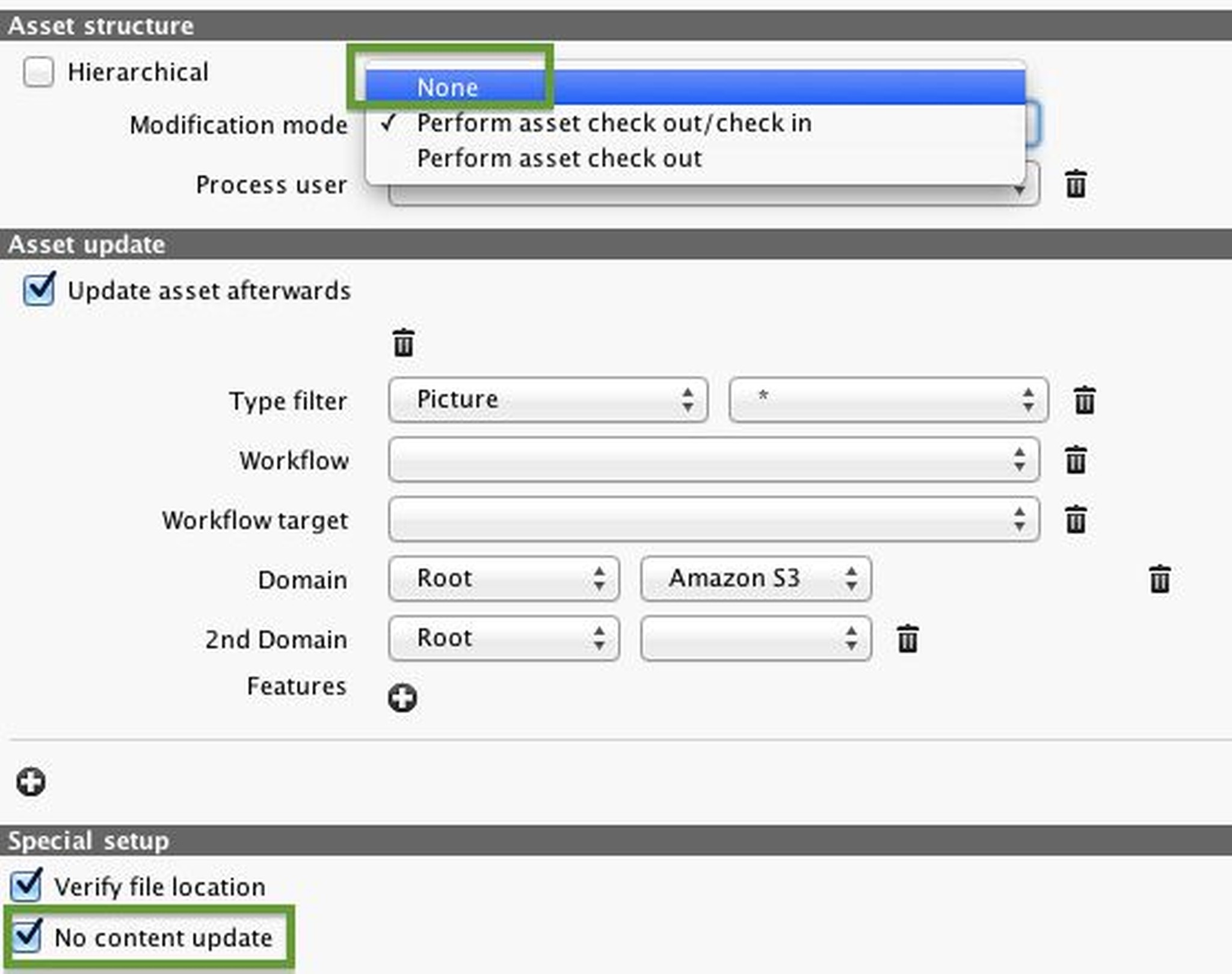 The activated option suppresses automatic content updates if the hash code remains unchanged for the master storage item. Using this new option, during check-in the storage items are verified by the Asset Management. Therefore the flag content update flag will be set. So you should also set "Modification mode" to "None" right above in the section "Asset structure" of the modules dialog.