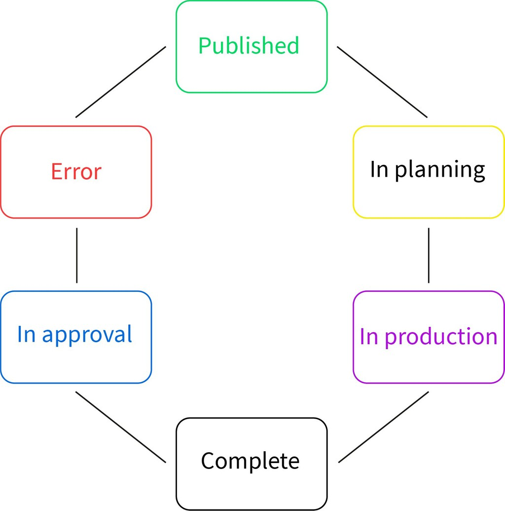 | Error | If necessary, adjust data, or add/delete content. Use this state also to mark outdated assets. |