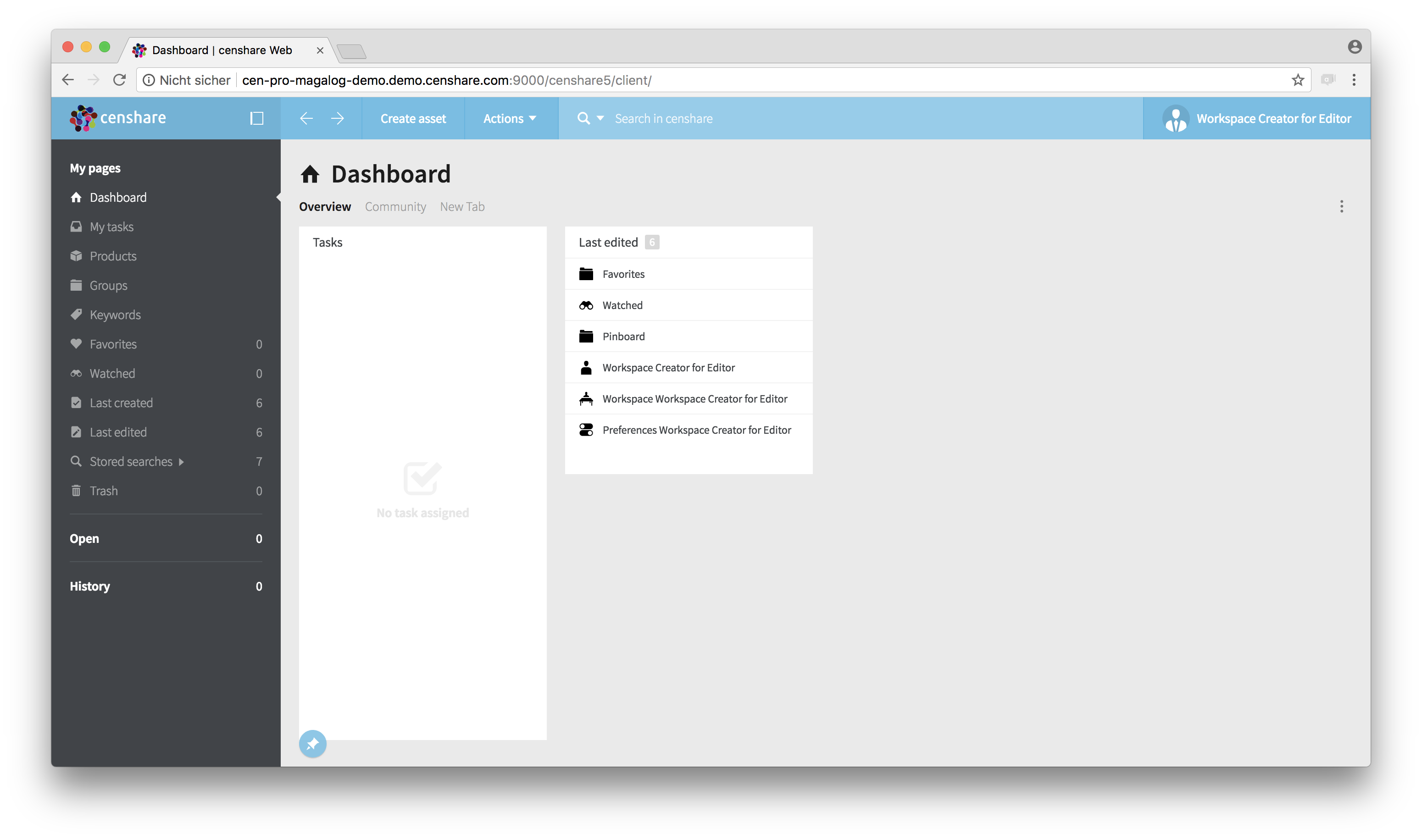 The user asset of currently logged in user "Workspace creator for editor" opens in new asset page: