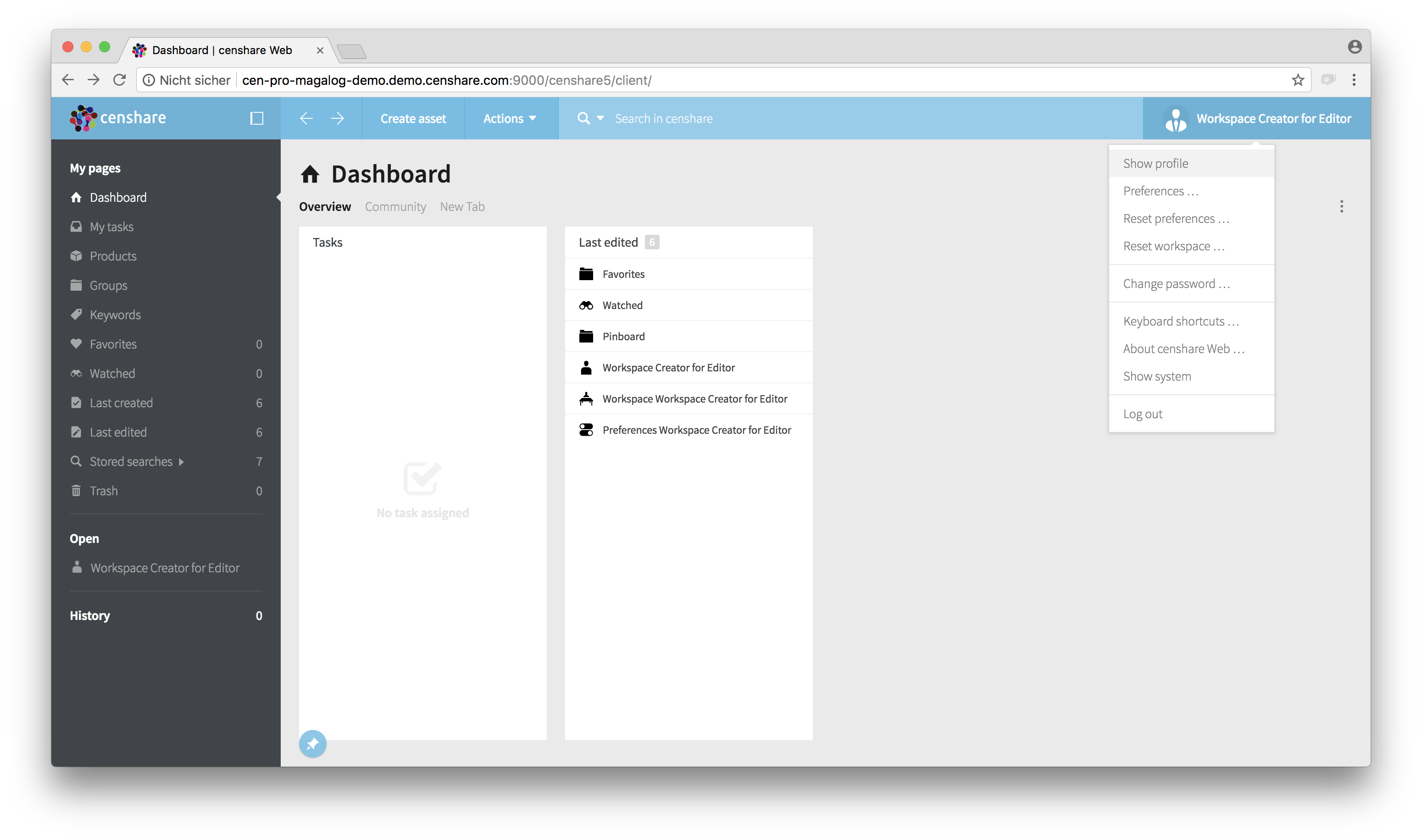 If a user changes his workspace in the user settings, this prevents censhare from applying the new workspace template to that user. In this case, ask "John Doe" to reset his workspace by clicking "Reset workspace" in the user menu: