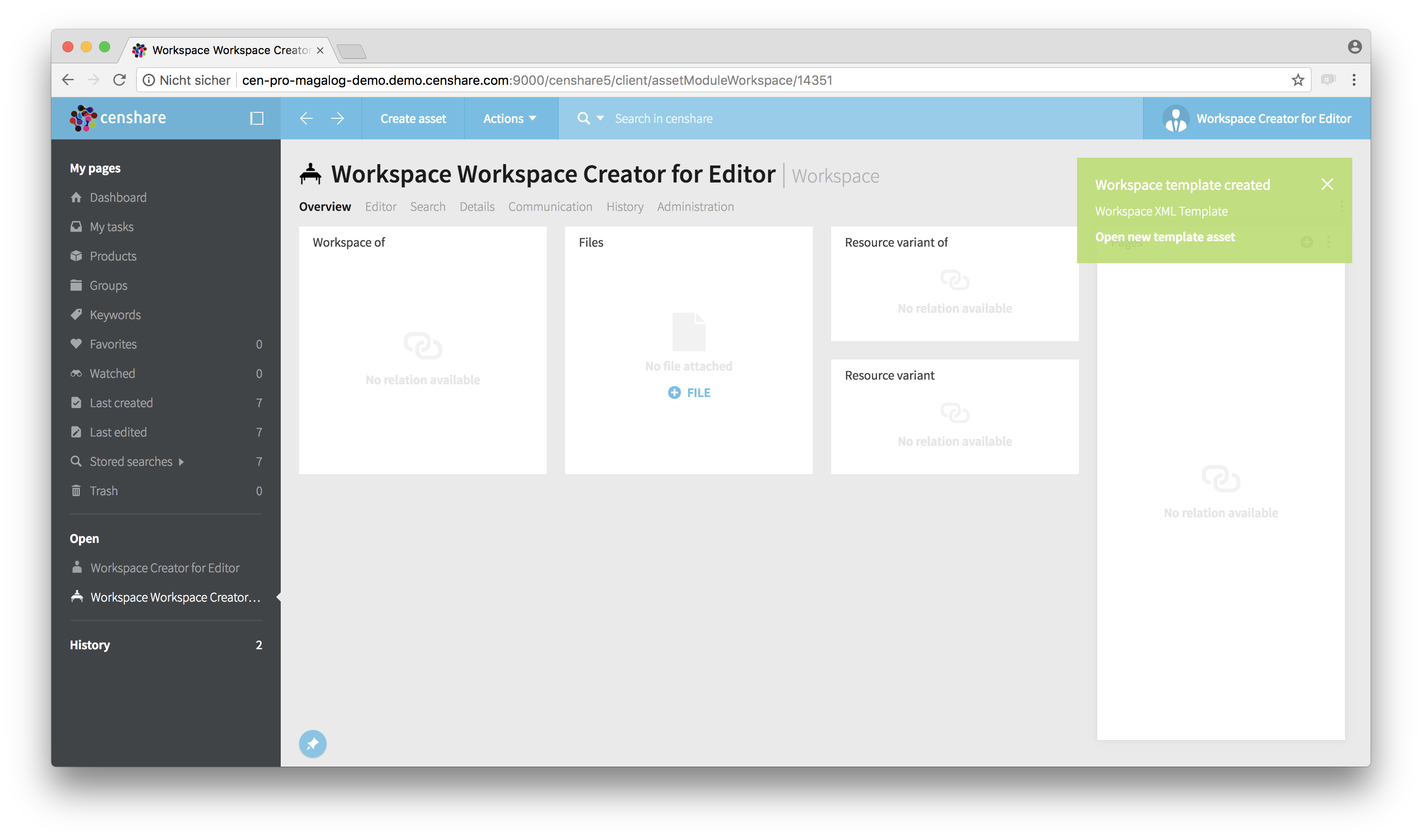 When creating a new XML workspace template, the message "Workspace template created" is shown. Click on "Open new template asset" below in the message dialog: