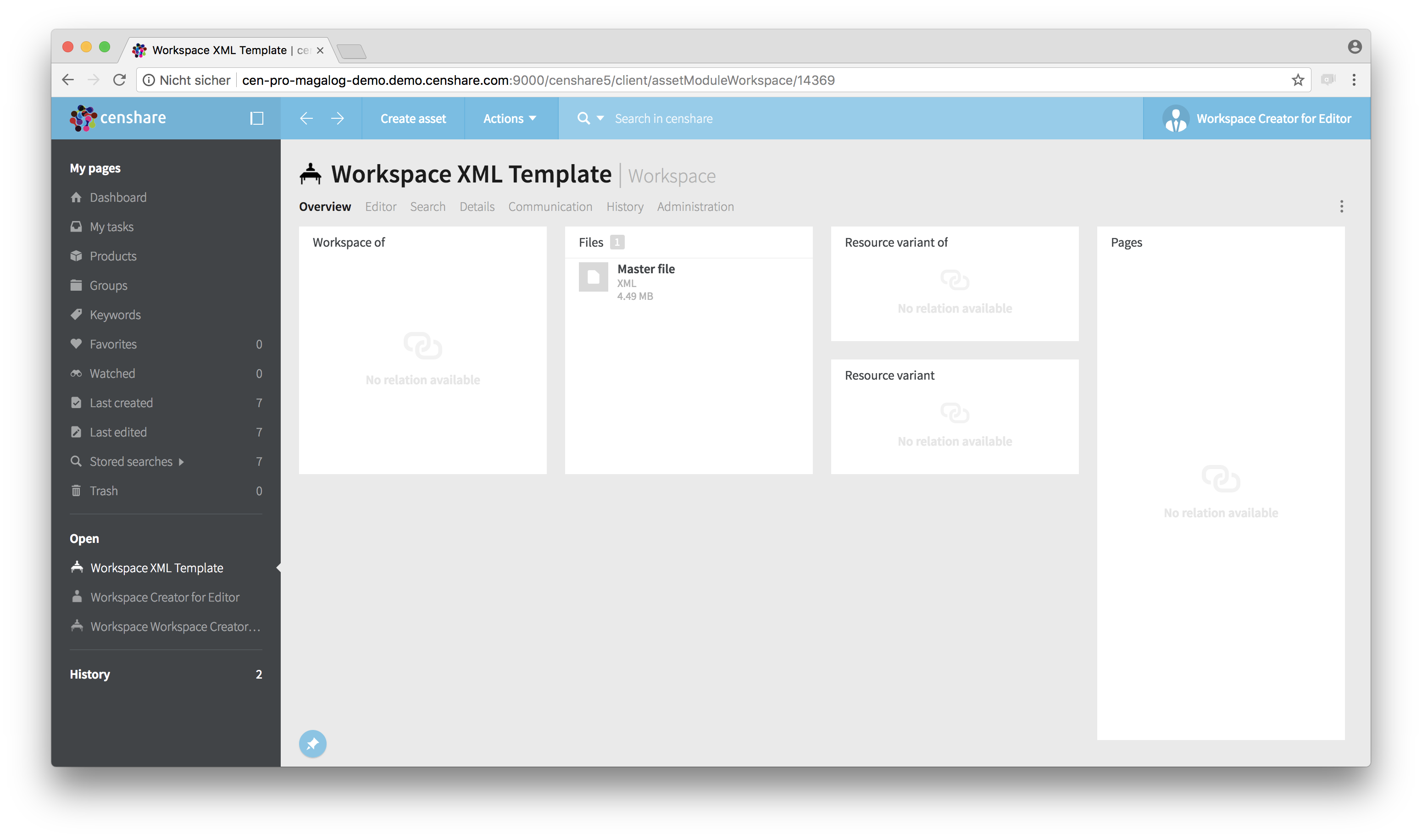 XML workspace templates store a complete workspace in a single XML file. For administrators of censhare instances, this is a convenient way to create workspace templates based on the default workspace structure of censhare Web.