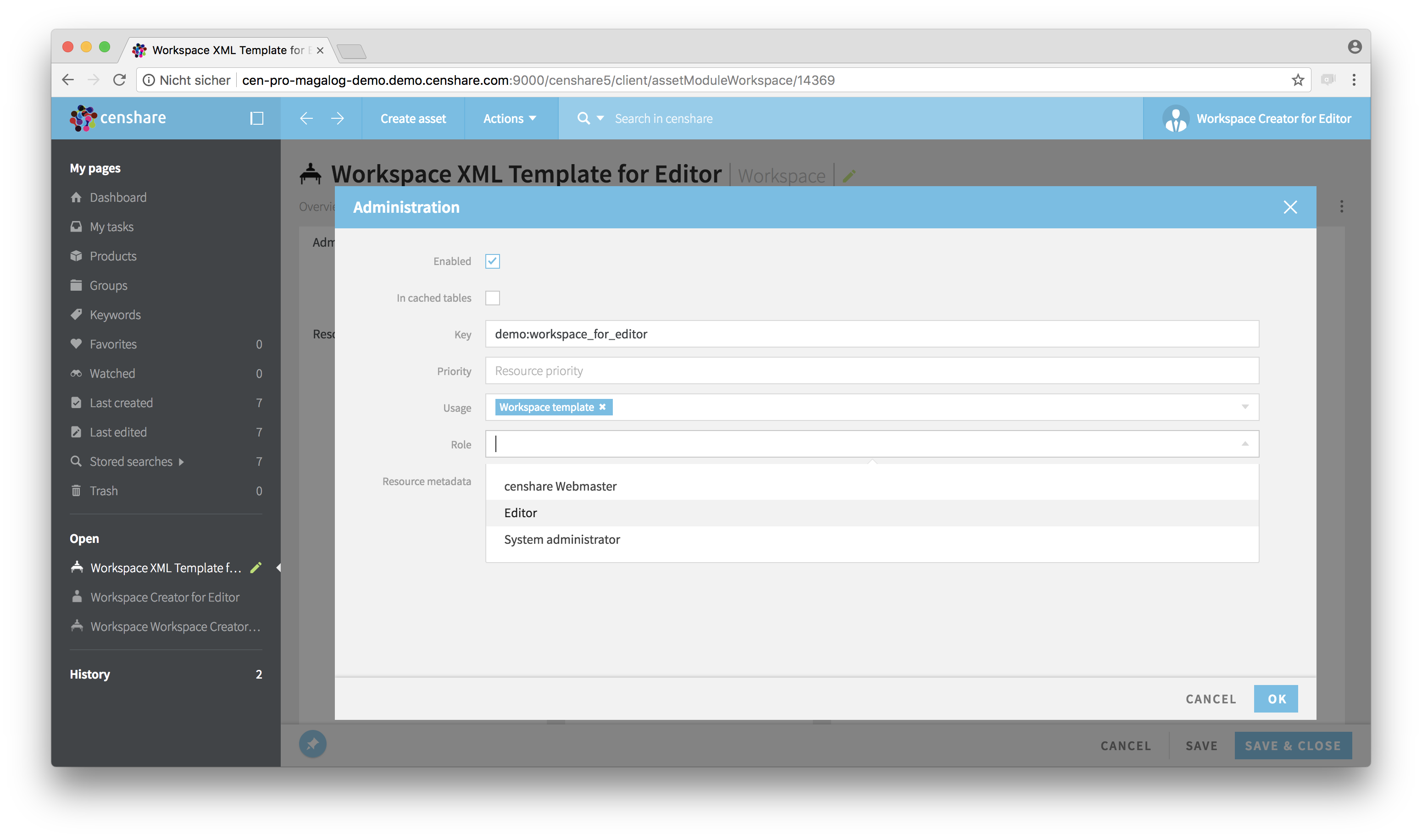 Resume: You have now renamed the new workspace asset and assigned it to the "Editor" role.