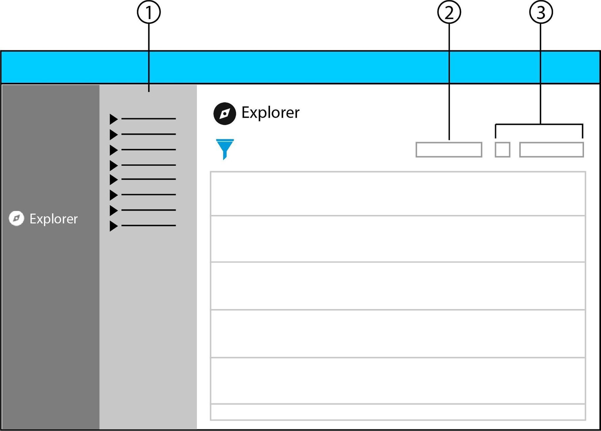 The Asset explorer page shows a filter bar (1), a free text filter field (2) and sort/view options (3).