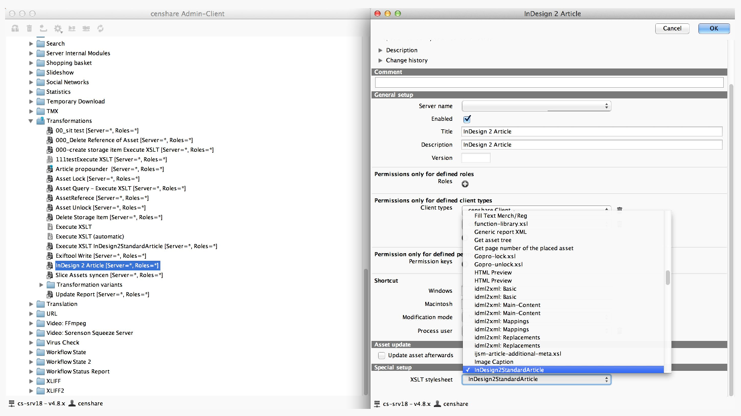 When editing the transformation asset, you may check if your expressions quickly. censhare includes an XSLT Evaluator Test to easily test the output of your XSLT. Select XSLT Evaluation Test from the menu.