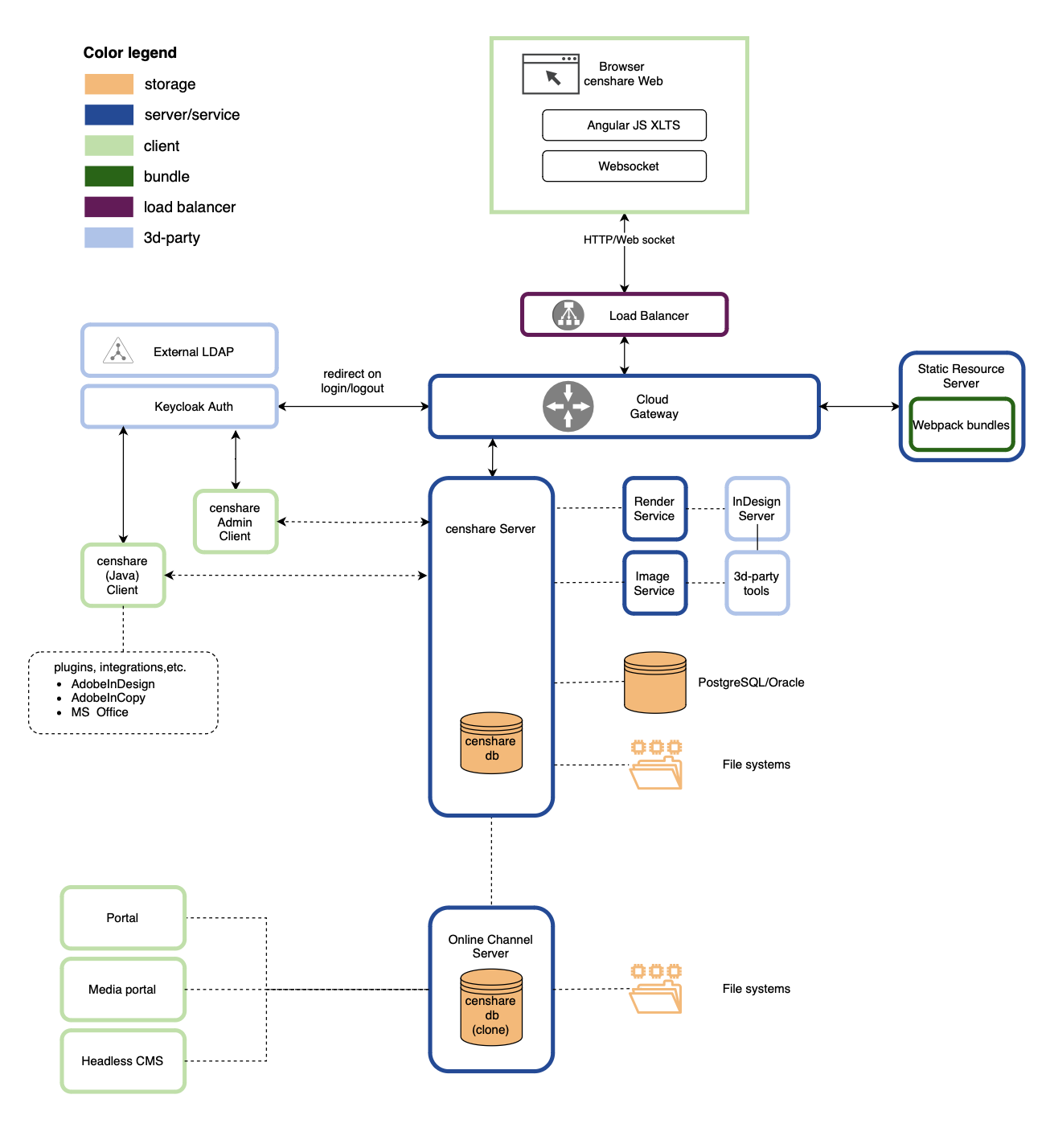 The Cloud Gateway is the entry point to censhare. The Cloud Gateway hides and protects all other components to the outside. The Cloud Gateway routes requests from the web browser to the following components: