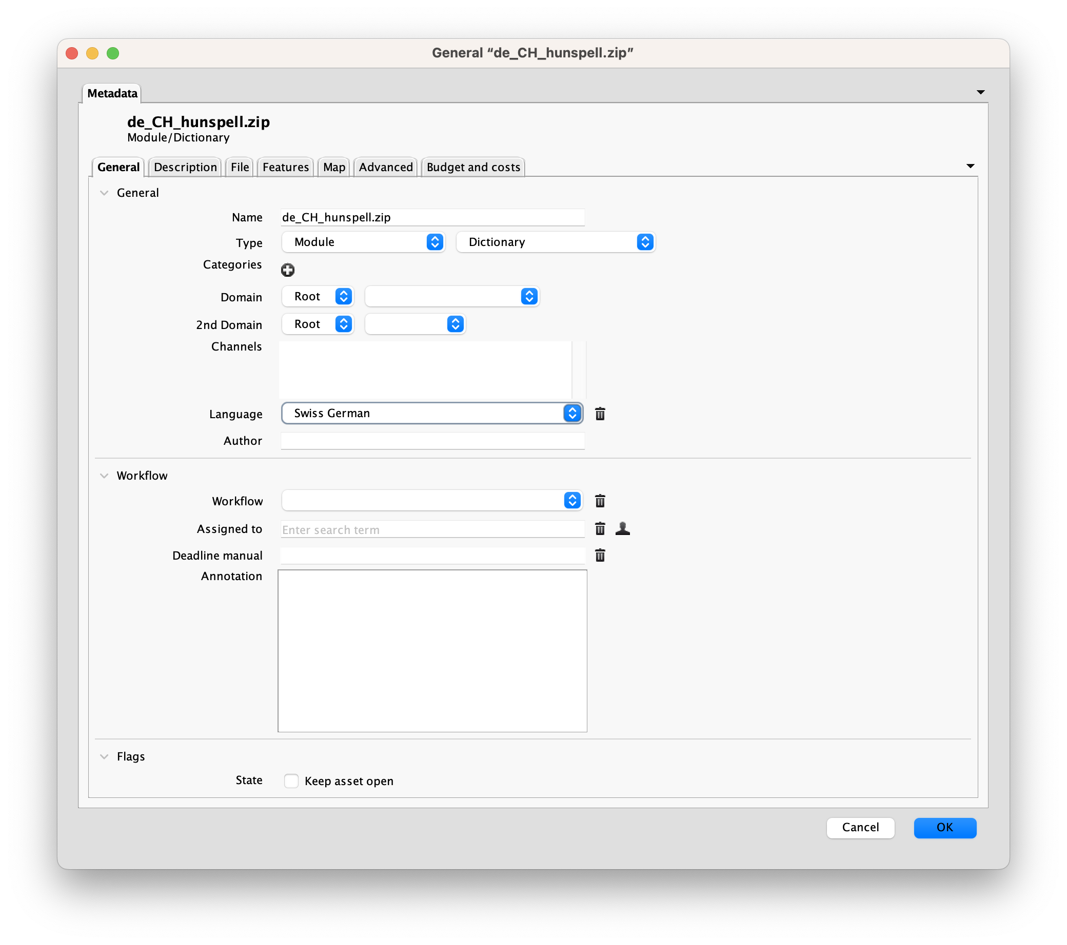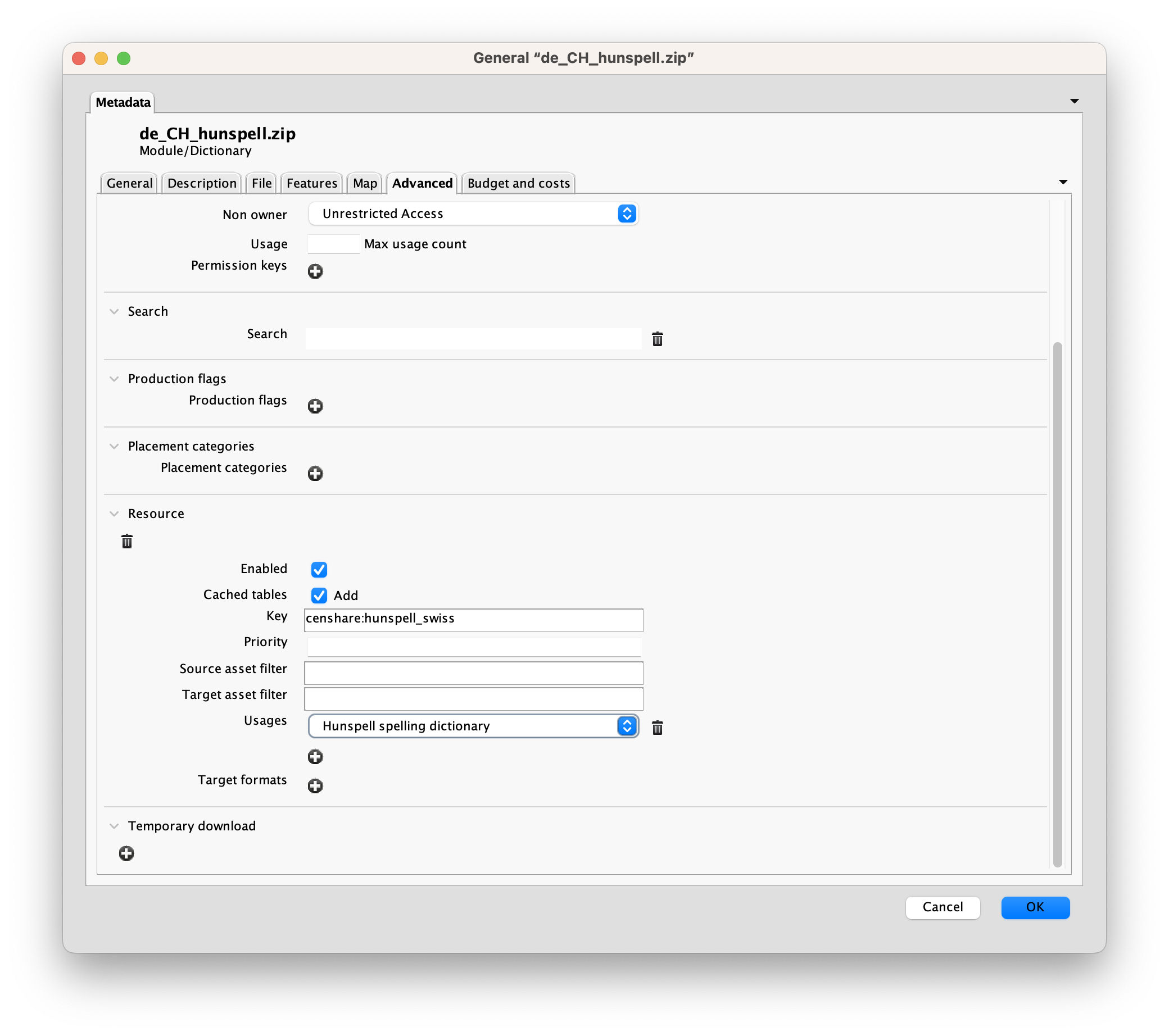 • Under the Resource - Key, enter censhare:hunspell_<<language>>