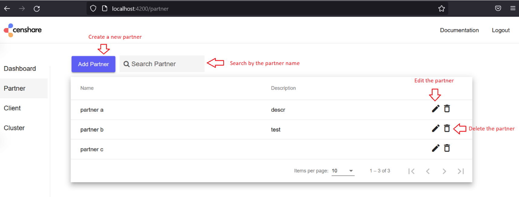Next, you need to add partners in the web application. This can be done in the Partner tab on the left side of the GUI.