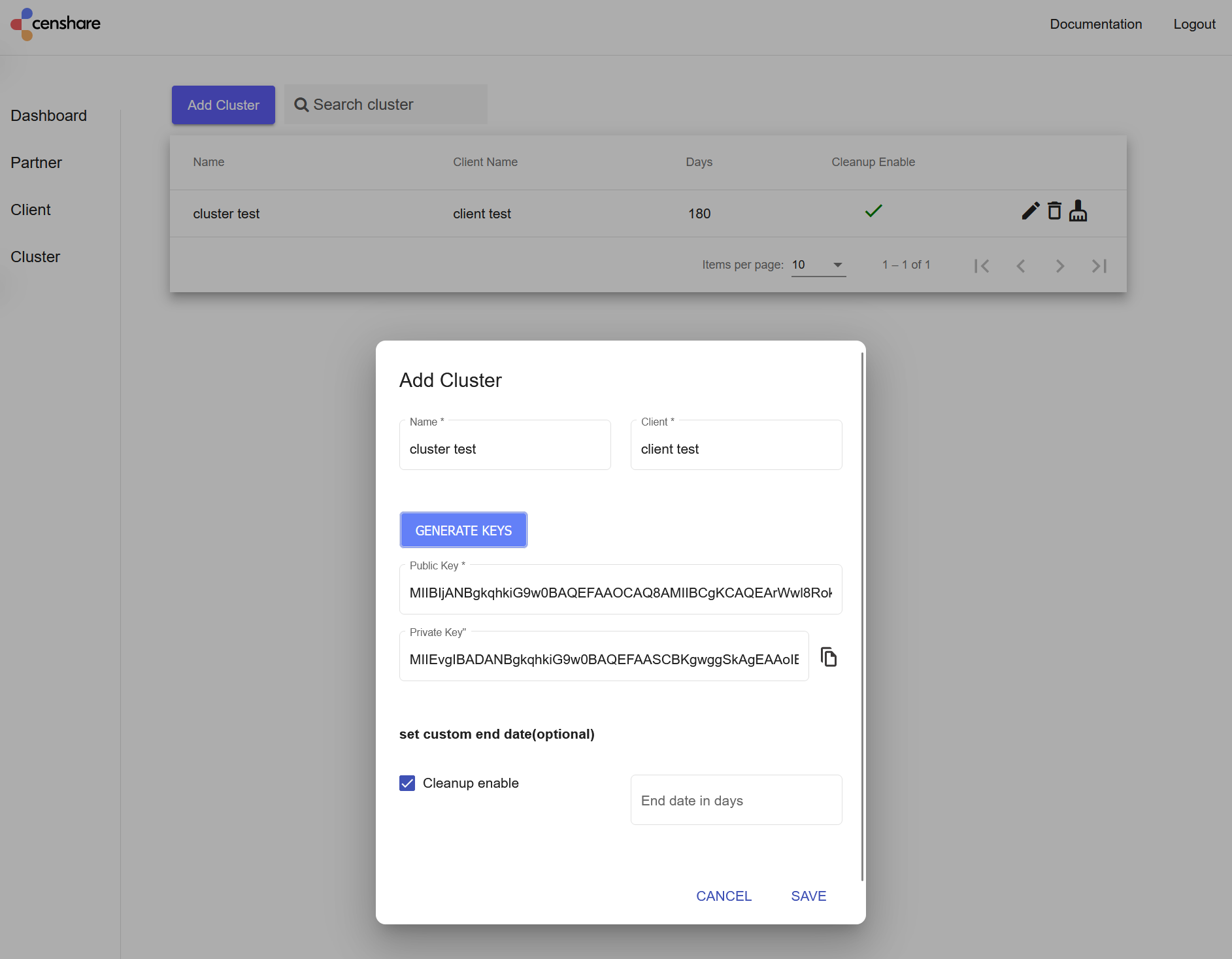 - In case you lost the private key, or you suspect the private key has been compromised, you can generate a new pair. Click the editing icon next to the cluster, regenerate the keys, copy the private key, and save the changes. Propagate the new private key to the cluster: add it to the Sender client on each server in the cluster.