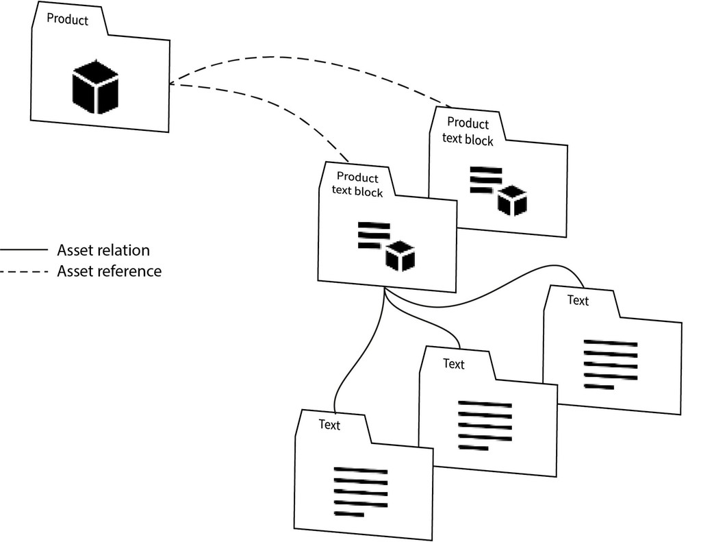 Product text blocks are referenced in products, product categories, or product outputs. Product text blocks contain one or multiple Main content text assets. Each Main content item stores the text snippet in an XML storage item. The XML schema follows the standard content structure.
