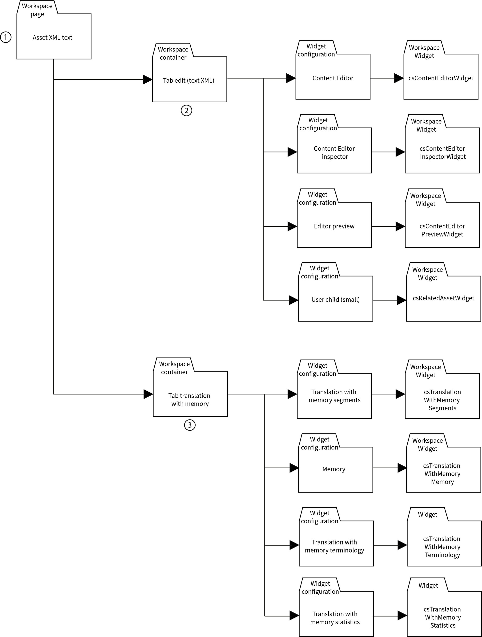 This graphic shows you a section of the workspace structure for text assets with the MIME type XML (1). The asset page of this asset type shows the "Editor" (2) and "Translation" tabs. In these tabs, the widgets for the appropriate editor and other widgets are connected via widget configuration assets. To make changes you have to create new widget configuration assets and connect these in a workspace container.
