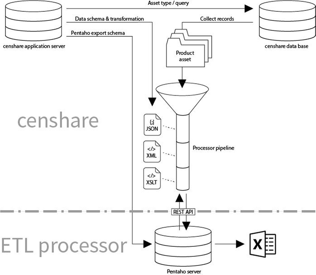 In the export direction, the processor pipeline collects the data from the selected assets (products) according to the schema and creates an XML representation. censhare then passes this XML file to the Pentaho server, where the data are transformed and output. For this step, users have to select an Export transformation in censhare when calling the server action. A dialog provides a list of available transformations. For more information, see Create custom schemas and transformations for the PIM connector. The Pentaho export asset contains the transformation and job files for the Pentaho server (Kettle transformation files and Kettle job files). Optionally, you can provide test data in order to test the output without production data from your system.